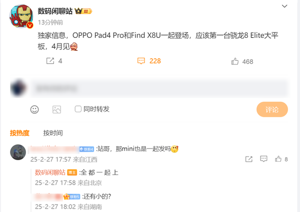 【CNMO科技消息】2月27日,有数码博主爆料,OPPO将在4月同步发布OPPO Pad4 Pro和OPPO Find X8 Ultra。其中,OPPO Pad4 Pro将成为首款搭载骁龙8 Elite的大尺寸平板。