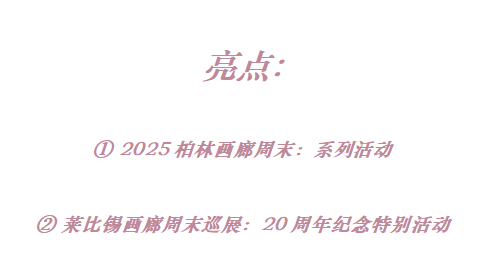 “Berlin X 2”两大亮点包括“2025年柏林画廊周末”和“莱比锡棉纺厂画廊周末20周年特别活动”,后者将在历史悠久的Baumwollspinnerei棉纺厂举行,此行将为您揭开当代艺术最前沿的神秘面纱。