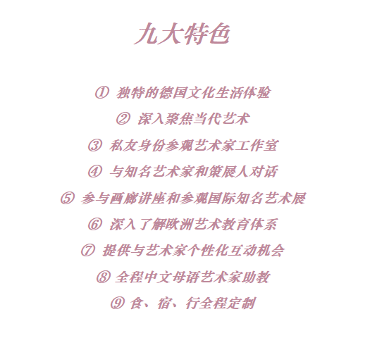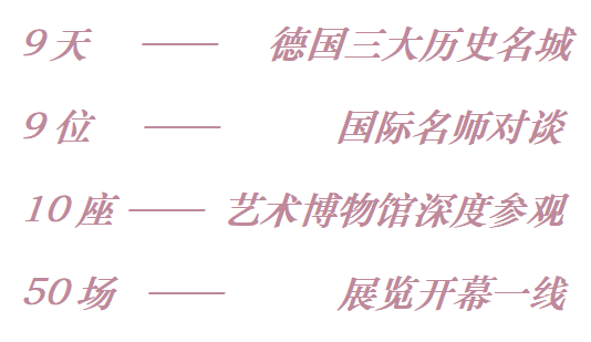 第一站的柏林艺术之旅,我们将与众多知名艺术家、策展人和文化制作人面对面交流,他们大多是高校教授、画廊主理人、艺术领域先锋人物。我们将和他们探讨当代艺术的不同概念、形式和观念。当然,他们也很期待聆听我们的工作、兴趣……我们还将拜访知名工作室,在艺术家创作现场举行座谈,让您身临其境体验艺术家的日常工作状态,包括他们从最初创作到作品在画廊或博物馆呈现的全过程分享。
