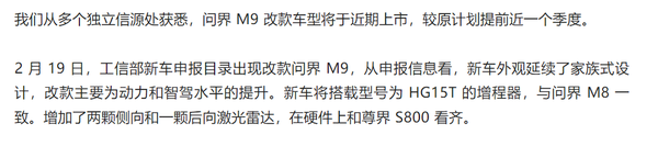 【CNMO科技消息】2月27日晚,CNMO了解到,据媒体“晚点Auto”报道,问界M9的改款车型近期内便会推向市场,这比原先规划的时间提前了近一个季度。