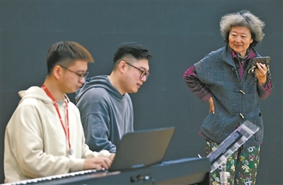 1月22日,音乐治疗师王瀚林(中)、罗睿凡在进行社区“春晚”的彩排,老人在一旁静静欣赏