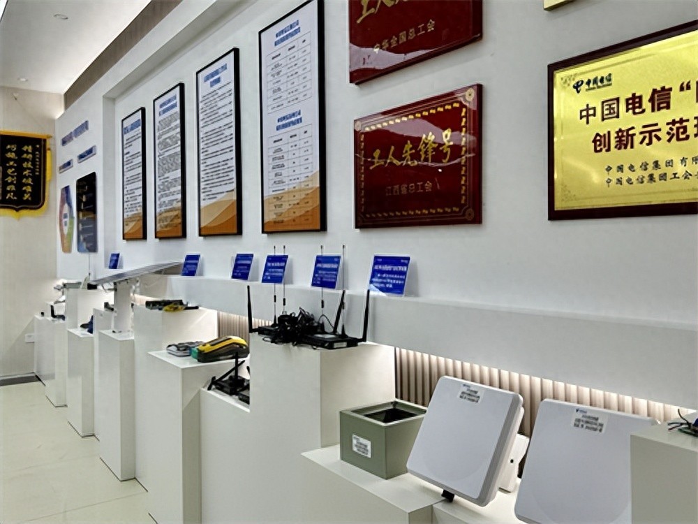 位于江西省抚州市的“宗强班”大厅内,磁石式电话、寻呼机、5G手机、卫星电话都陈列其中,展示出一条中国通信的发展轨迹。墙的另一侧,整齐摆放着5G户外太阳能供电板、无线隔离罩、PDH光端机带外监控模组等创新项目产品成果。