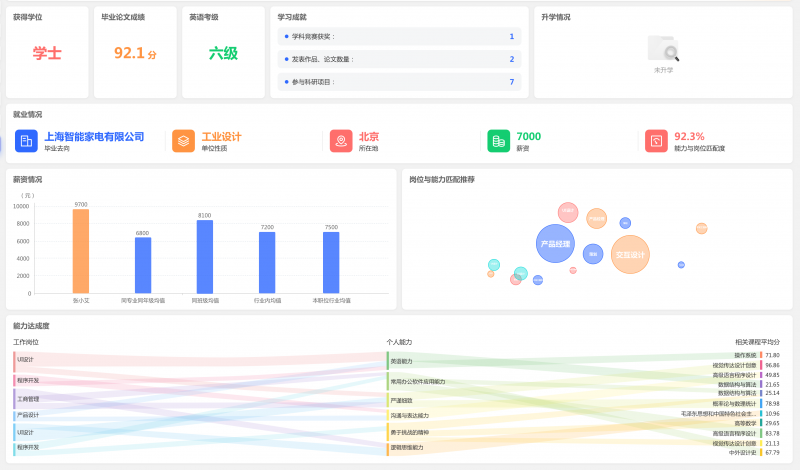 ☑ 学生画像:深度挖掘学习能力、学习行为、能力图谱、身心健康、思想道德、校园生活、学业达成、奖学勤贷惩处各类过程性数据,自动生成学生成长报告,构建多元化、智能化、动态性、连续性的学生学业评价大数据模型,生成学生学业数字“画像”。