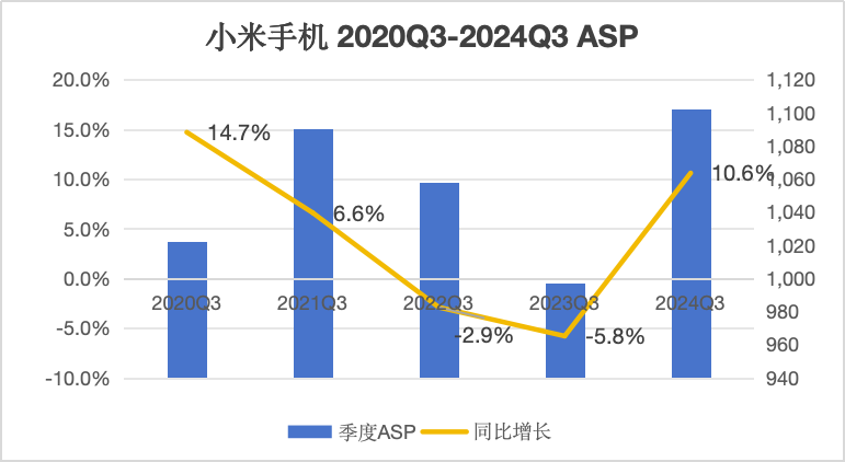 一家手机厂商的ASP(平均销售价格)是衡量其高端化程度的核心指标,从ASP来看,小米最近发布的2024Q3数据达到1102.2元,创同期数据新高,但显然,离苹果和华为还有一定距离。