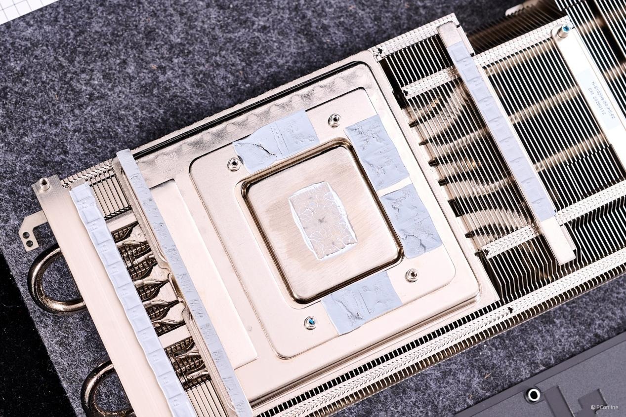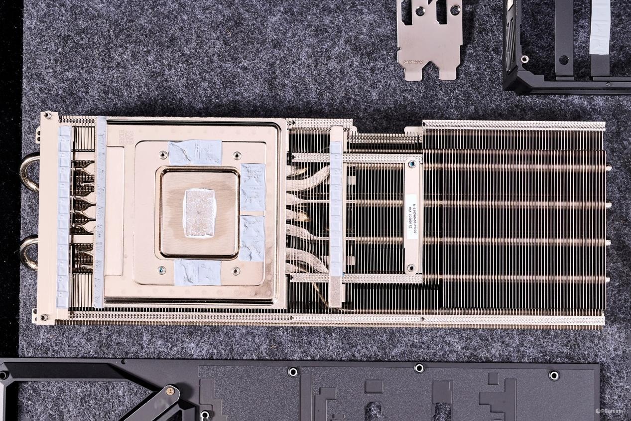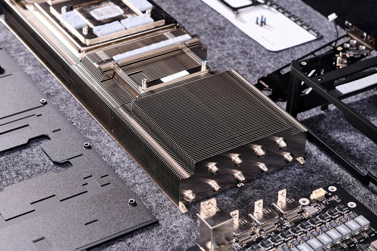 散热核心部分是一个巨大的VC均热板,采用真空冰片技术,实现了散热性能的显著提升。与传统铜底相比,VC均热板提供了更广阔的散热面积,更适宜于将GPU产生的热量均匀地传导至各个热管和散热模块,从而达到更高效的散热效果。