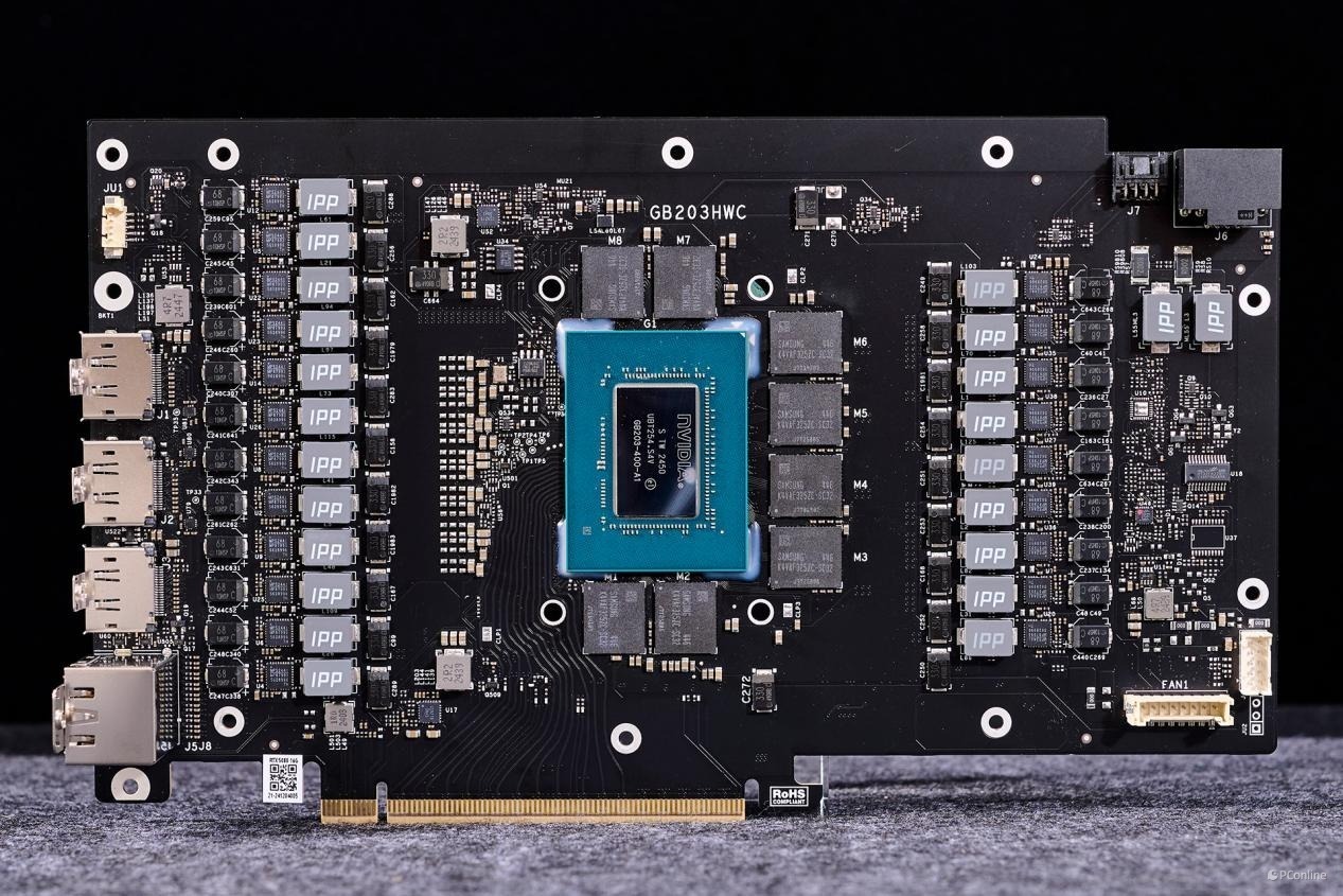 iGame GeForce RTX 5080 Vulcan OC 16GB火神显卡的PCB可谓是短小精悍,越肩式的PCB设计可以容纳下更多的供电。因此可看到显卡PCB两侧分布了14+4+3相供电,中间是GB203核心与8颗GDDR7显存颗粒。