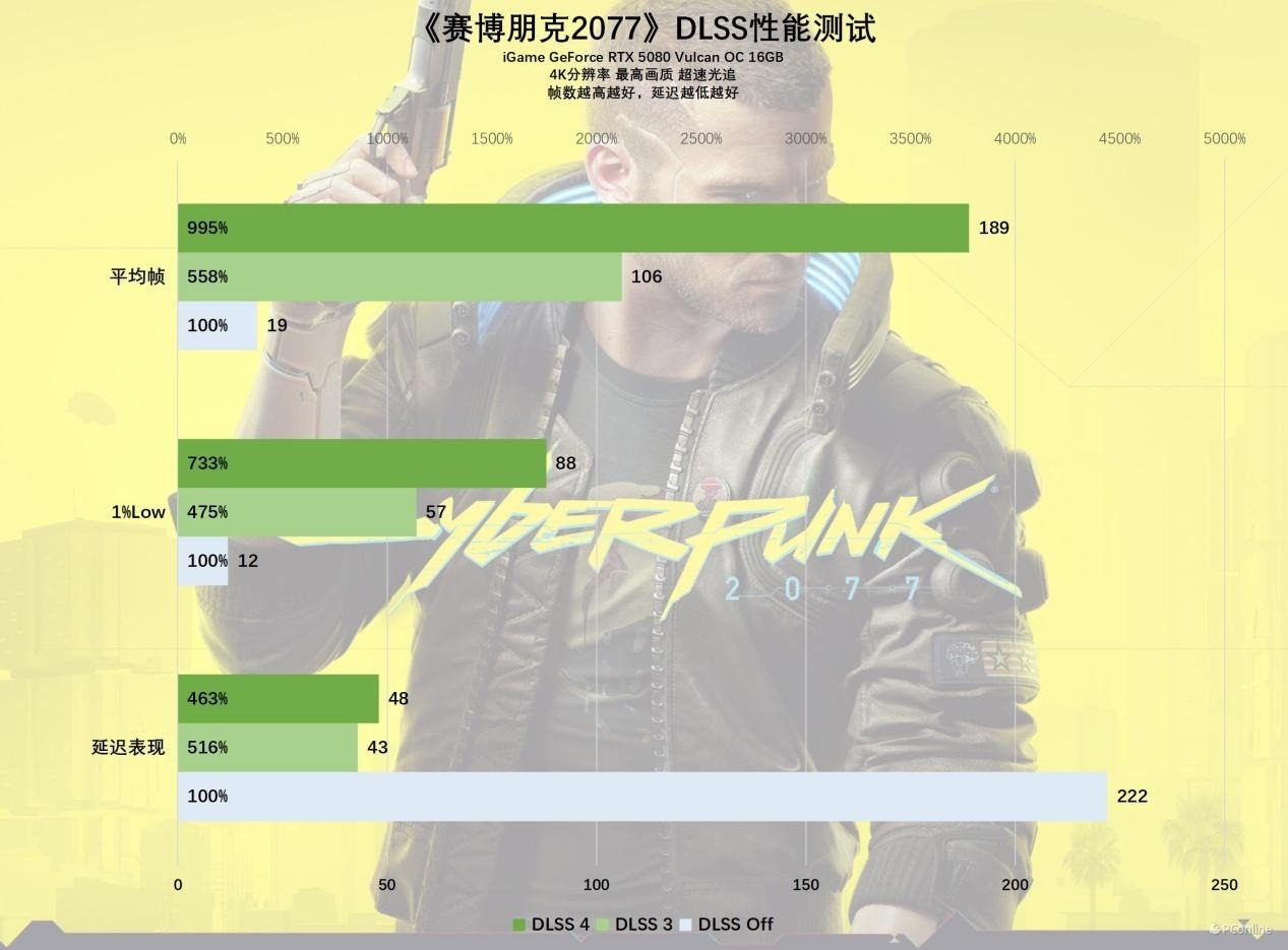 接下来,让我们深入了解DLSS 4的性能表现。作为“显卡杀手”,DLSS 4对显卡的挑战确实非同小可。在最高画质与路径追踪的设置下,即便是性能强劲的iGame GeForce RTX 5080 Vulcan OC 16GB火神,其表现也仅为19 FPS,几乎难以提供流畅的游戏体验。然而,当启用DLSS 3技术后,游戏的帧数跃升至106 FPS,流畅度显著提升。进一步开启DLSS 4,iGame GeForce RTX 5080 Vulcan OC 16GB火神的表现更是惊人,达到了189 FPS,性能提升了惊人的8.9倍。更令人印象深刻的是,1%Low的帧数几乎与DLSS 3下的平均帧数持平,这意味着游戏中的掉帧现象极为罕见,整体稳定性极高。