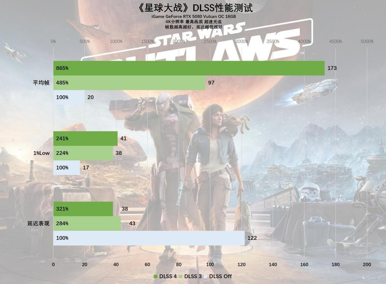 在这款游戏中,DLSS 4的实际效果令人印象深刻。在4K原生分辨率下,iGame GeForce RTX 5080 Vulcan OC 16GB火神的平均帧率仅为20 FPS,延迟也高得令人担忧。然而,当启用DLSS 4性能模式后,游戏的平均帧率飙升至173 FPS,游戏体验瞬间变得如丝般顺滑。与原生4K相比,性能提升了大约8.5倍。即便是与DLSS 3的97 FPS相比,性能也几乎翻了一番,这确实是一个令人满意的性能提升。
