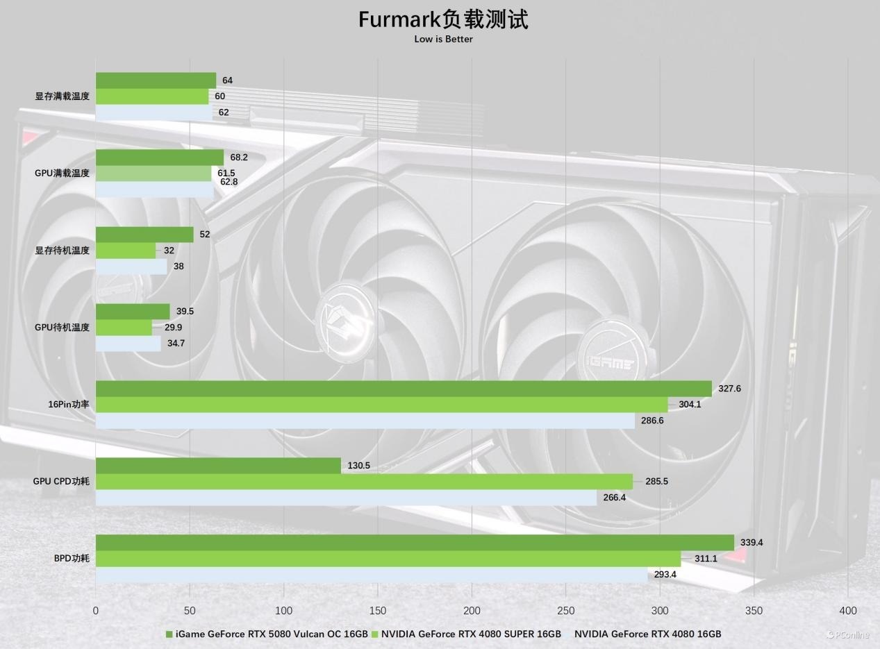 在比较RTX 4080与RTX 4080 SUPER时,我们可以观察到,尽管iGame GeForce RTX 5080 Vulcan OC 16GB火神的热设计功耗(TDP)有所增加,但其烤机功耗依然保持在较低水平。此外,该显卡在核心与显存的温度管理方面表现出色。