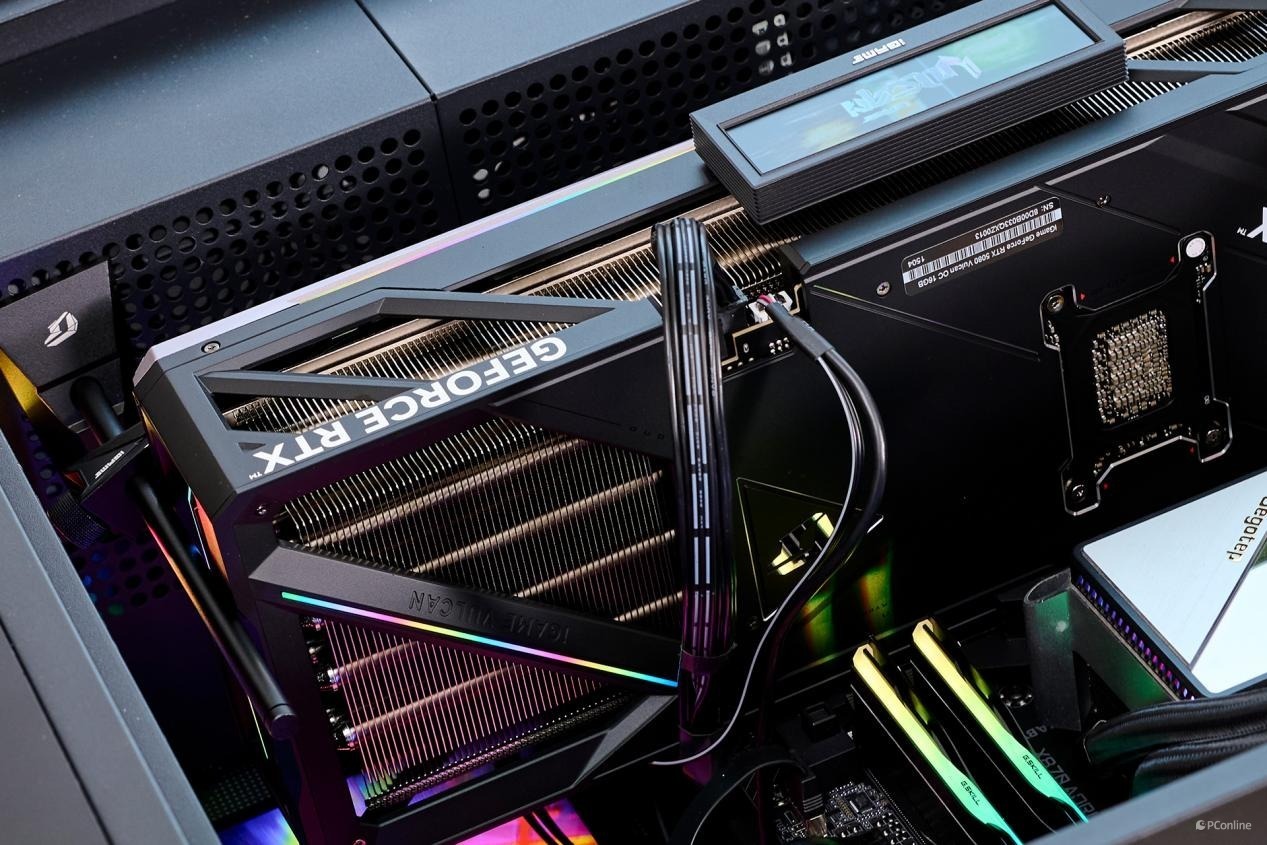 对于一款高性能显卡来说,散热能力的强弱直接影响着其性能的发挥和稳定性。iGame GeForce RTX 5080 Vulcan OC 16GB 在散热方面下足了功夫,采用了先进的旋涡(Vortex)散热装置,为显卡的核心部件提供了全方位的散热保障。