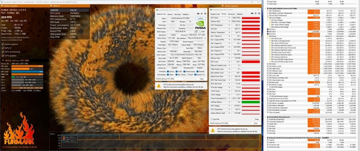 最后一项测试烤机,实测Furmark烧机10分钟后,得益于iGame GeForce RTX 5080 Vulcan OC 16GB火神出色的散热系统,核心温度并不高,仅有68.2度,显存温度也是64度,此时显卡的最大功率为339.4 W,已经完全顶着TDP的上限了,风扇转速则是1471RPM左右,属于较低的满载转速了,噪音控制很不错。