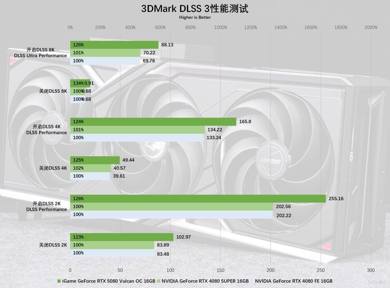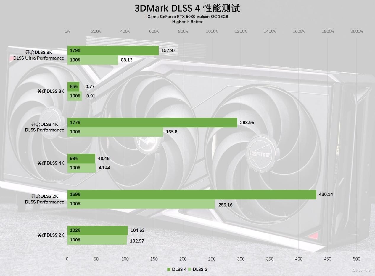 在进行简单介绍之后,让我们进一步探讨DLSS 4在理论上的表现,采用的是经典的3DMark测试。必须指出,iGame GeForce RTX 5080 Vulcan OC 16GB火神显卡与DLSS 4的结合,宛如神助,使得帧数再次实现了显著的飞跃!