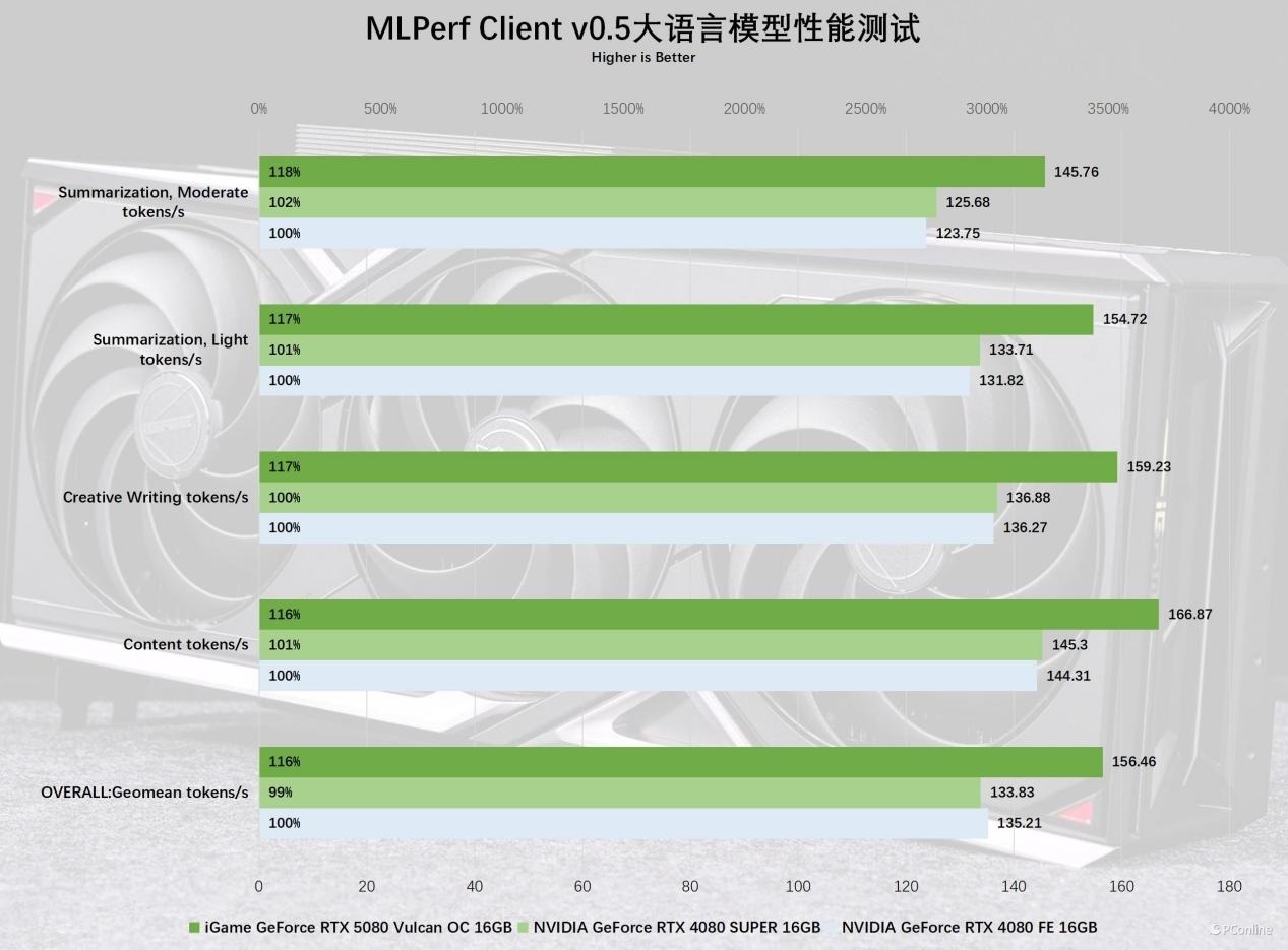 在AI文本生成测试中,iGame GeForce RTX 5080 Vulcan OC 16GB火神在一众大语言模型里同样表现出众,我们用MLPerf Client v0.5大语言模型进行测试,它是基于meta的Llama 2 7B开源LLM打造,涵盖了四项AI任务,分别是内容生成、创意写作以及对两份不同长度文本进行总结摘要。实测iGame GeForce RTX 5080 Vulcan OC 16GB火神在每一项中都表现出了绝对的统治力,各项领先幅度均在16%~18%左右。