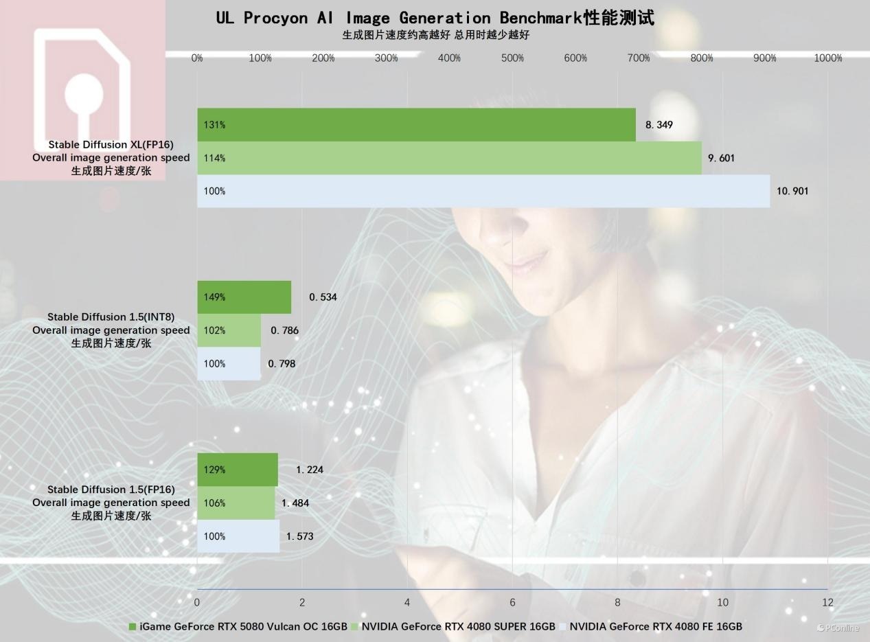 再看看iGame GeForce RTX 5080 Vulcan OC 16GB火神在Stable Diffusion中的表现如何,还是用UL Procyon进行测试,在比较轻松的SD 1.5文生图测试里,无论是采用FP16精度模型还是INT8精度模型,RTX 5080的表现都展现了旗舰级显卡应有的实力,特别是在INT8精度下,生成一张图的速度仅需0.54秒,效率比上代显卡快了48%,已经接近一倍了。而即便是在压力比较大的SDXL中,优势也非常明显,生成一张图的速度为8.439秒,同样领先RTX 4080或RTX 4080 SUPER达1~2秒。