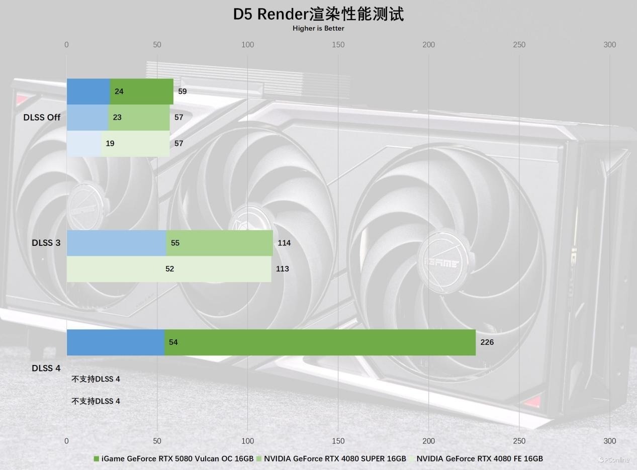实测iGame GeForce RTX 5080 Vulcan OC 16GB火神在开启DLSS 4以后,整个渲染预览的界面变得丝滑流畅,帧数基本在226 FPS附近,而对比不开DLSS时,仅59 FPS的表现来看,性能几乎是提升了4倍以上。即便是面对RTX 40系的DLSS 3,也一点不虚,性能优势也有50%以上。