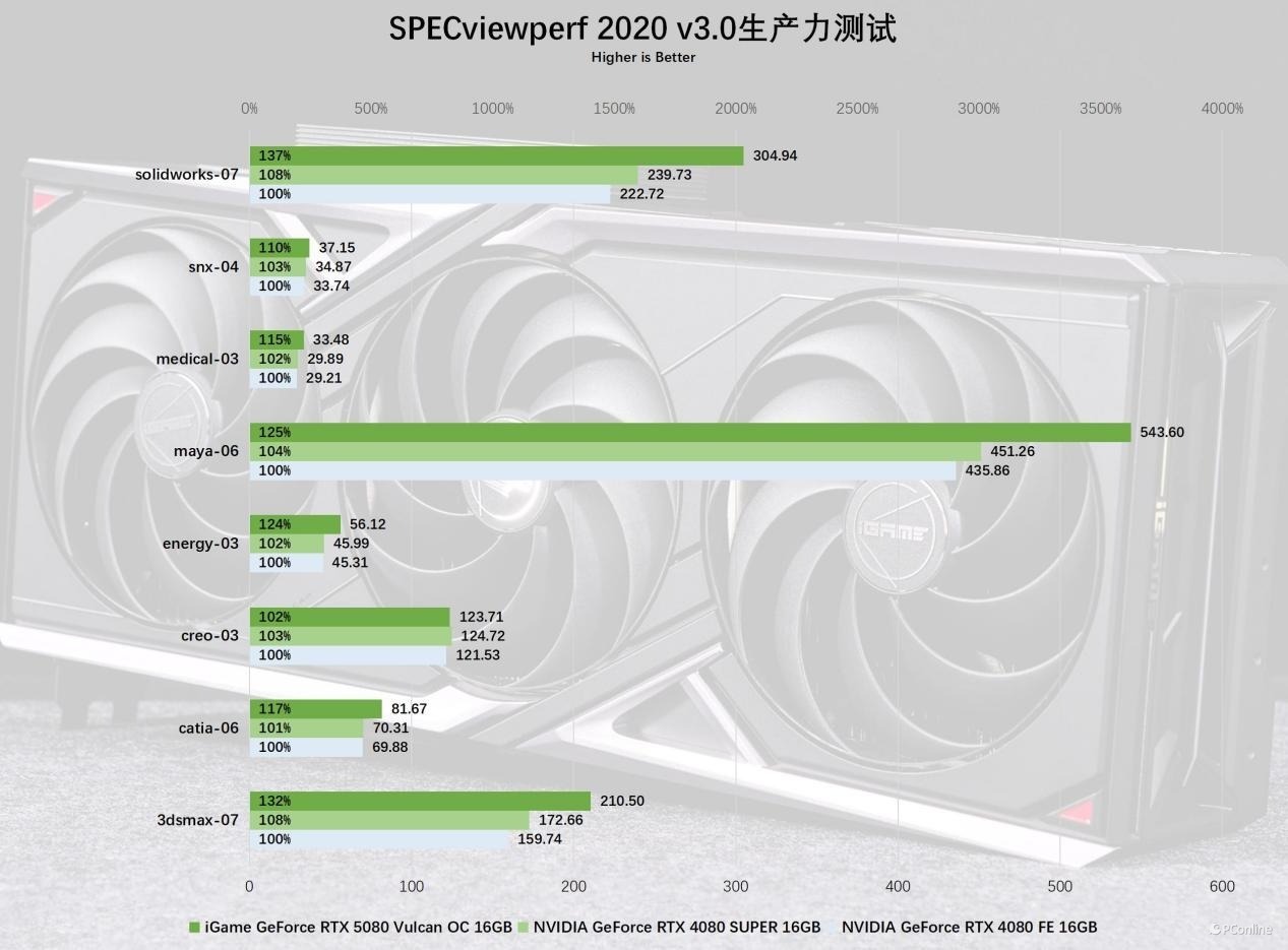 再看看工业领域的表现,SPEC2020能够反映显卡的工业能力,在多项测试中iGame GeForce RTX 5080 Vulcan OC 16GB火神依旧傲视群雄,对比RTX 4080平均有30%的提升,而对比RTX 4080 SUPER也在25%左右,这个性能提升还是很可观的,甚至有些超乎想象。