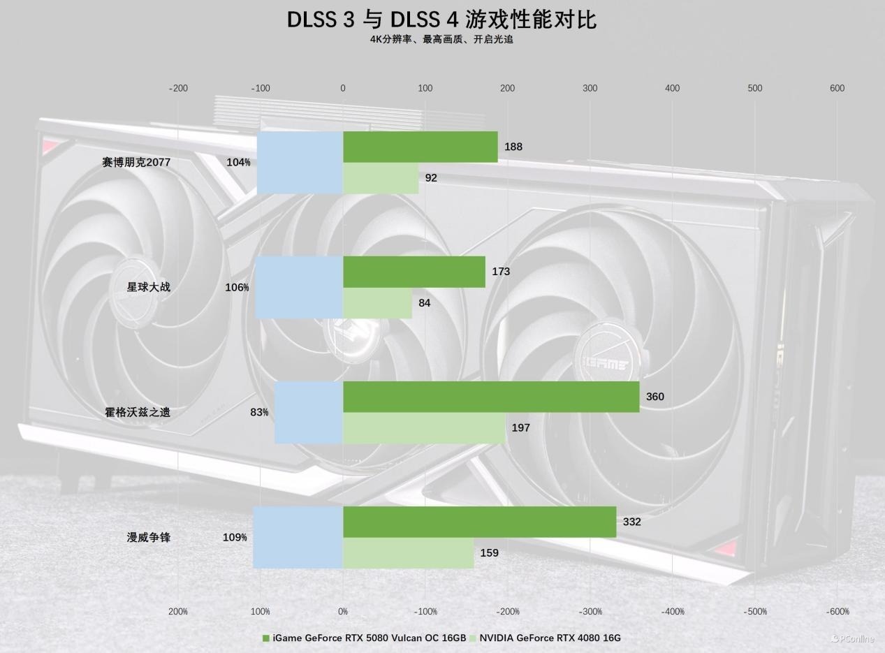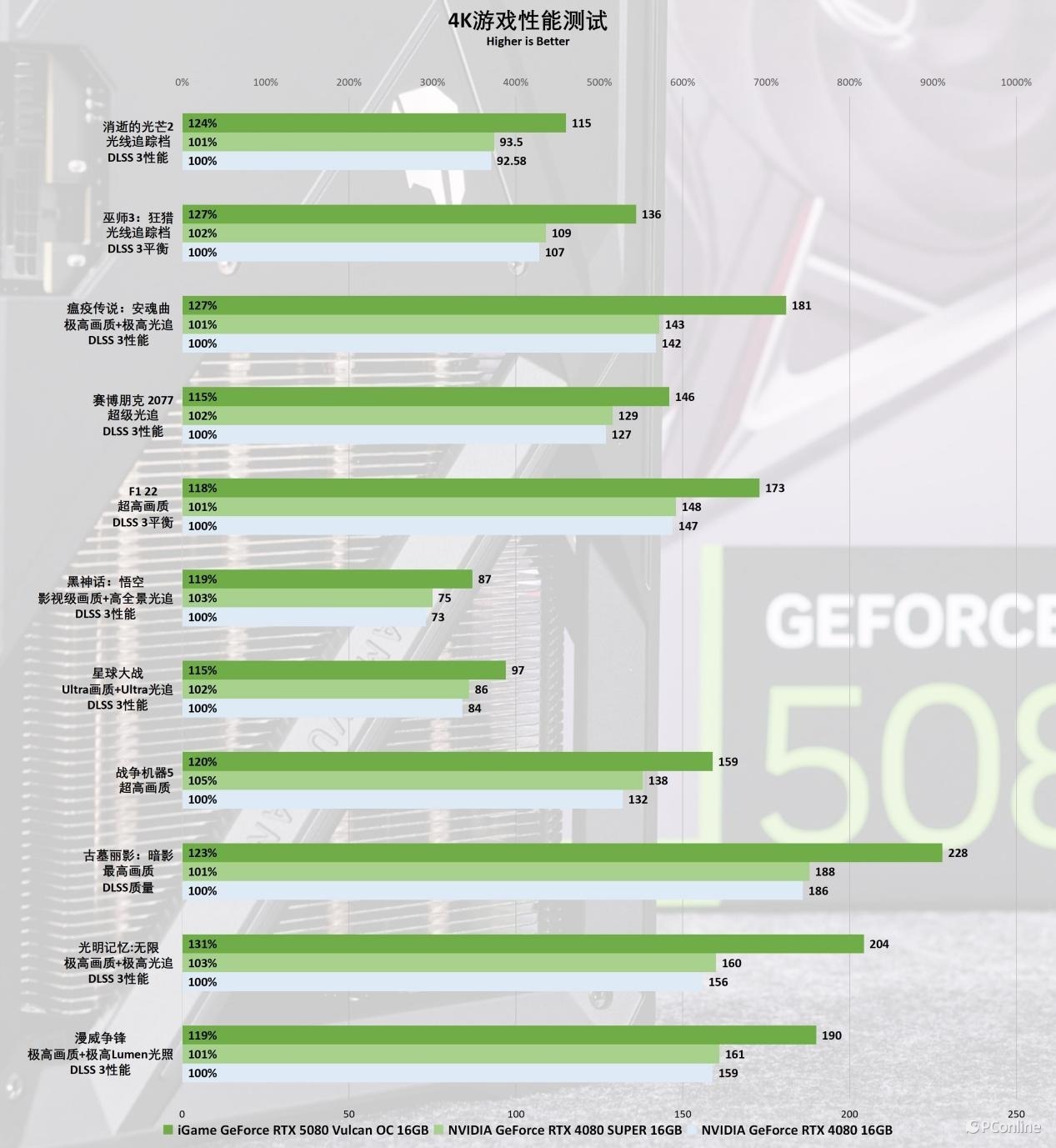 在实际测试中,iGame GeForce RTX 5080 Vulcan OC 16GB火神在4K分辨率下轻松应对了大多数游戏,尤其是在DLSS技术的加持下,实现4K@144Hz的电竞体验毫无压力。即便是将《黑神话:悟空》的设置调至全高,这款显卡仍能提供87 FPS的流畅体验,几乎触及了高刷新率的极限。可以预见,随着DLSS技术的进一步升级,帧数的提升将更为显著。在性能对比方面,iGame GeForce RTX 5080 Vulcan OC 16GB火神在众多游戏中表现出色,相较于RTX 4080 SUPER,其性能大约高出20%,而与RTX 4080相比,性能领先幅度更是可以达到25%以上。