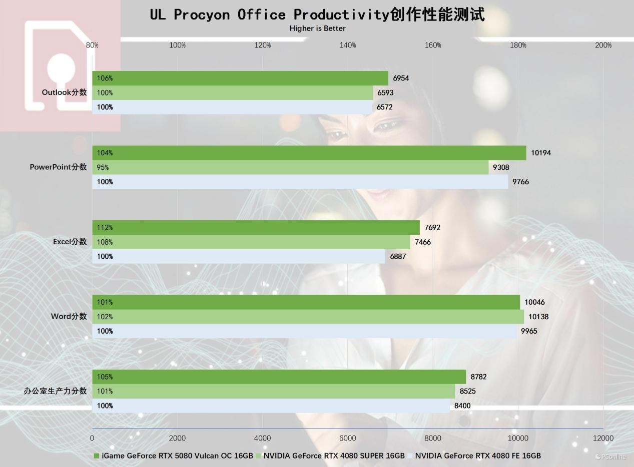 办公软件测试中,iGame GeForce RTX 5080 Vulcan OC 16GB火神表现也不错,整体性能可以领先5%左右,其主要领先在Excel、PPT以及Outlook三项,不过有一说一,这三张卡用来办公只能说确实有些浪费了,用它们打开这些软件,差距应该都是微乎其微的。