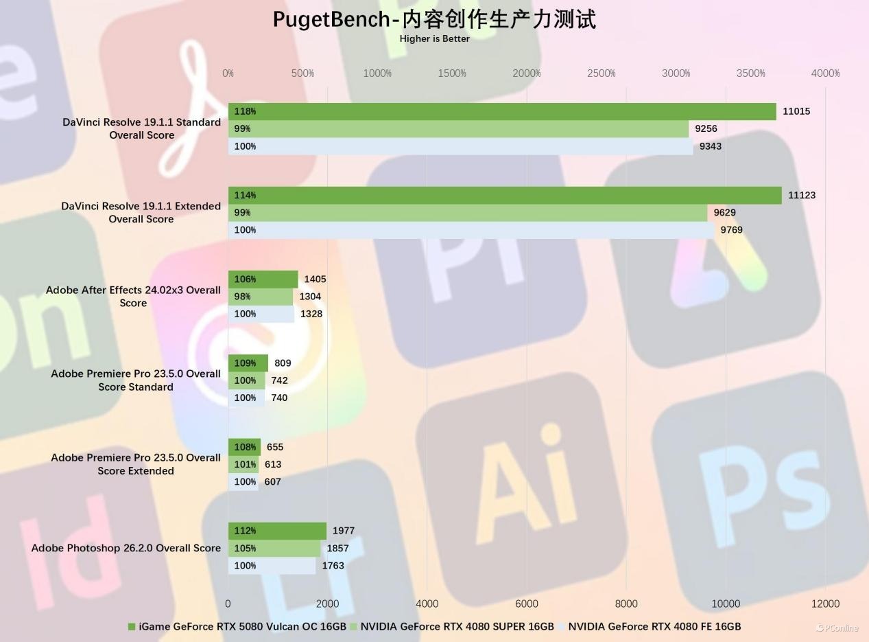 例如在达芬奇和PR的测试中,iGame GeForce RTX 5080 Vulcan OC 16GB火神领先RTX 4080约6%~18%,还是非常夸张的。同时在PS以及AE里也有小幅的性能提升,大约在4%~12%之间,总体来说就是内容创作的效率更高了。