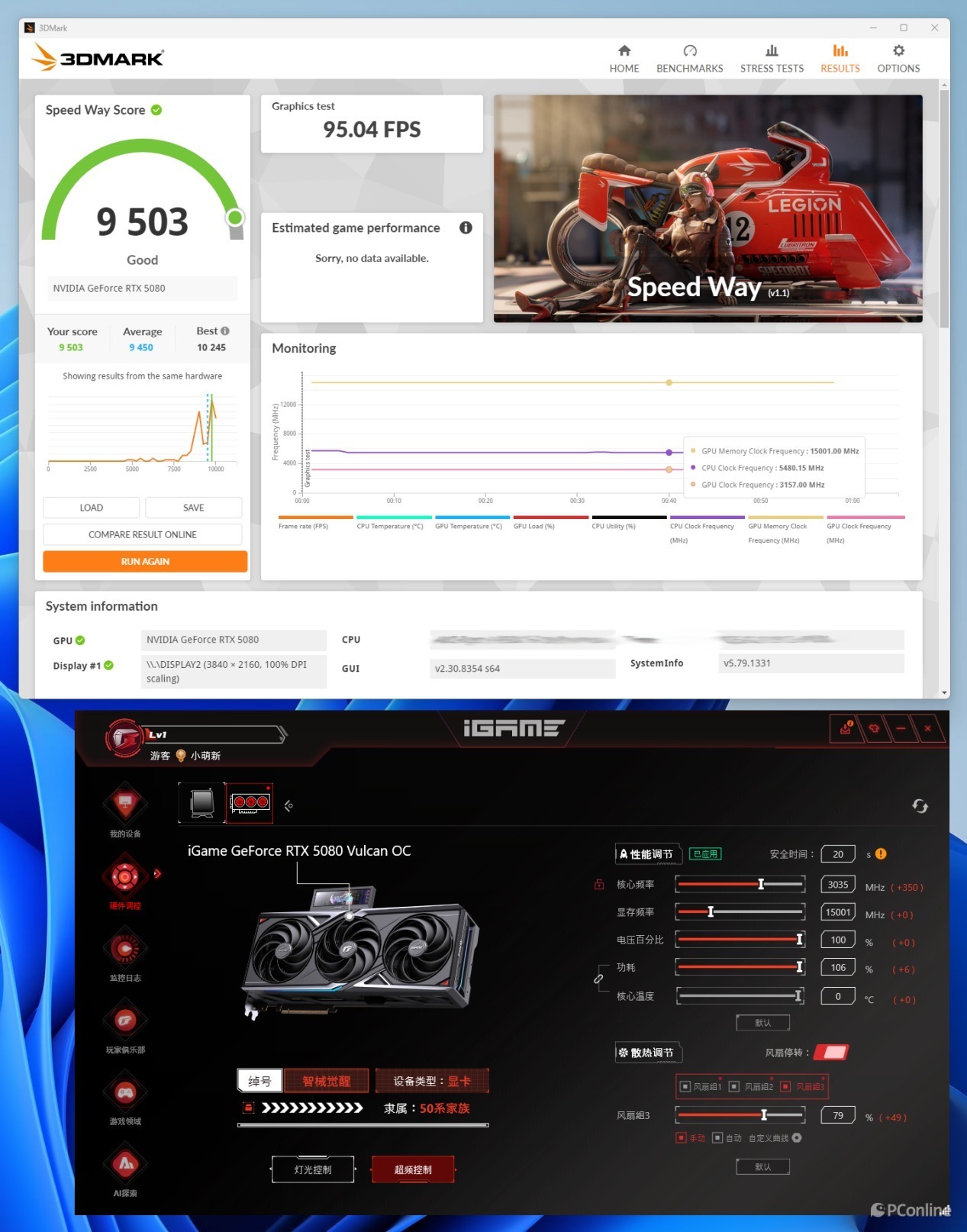 超频后,Speed Way性能得分为9503,相比默认频率时的9099,性能提升了4.4%。此时可看到iGame GeForce RTX 5080 Vulcan OC 16GB火神在Speed Way实际运行频率也达到了3157MHz,起步潜力相当不错。