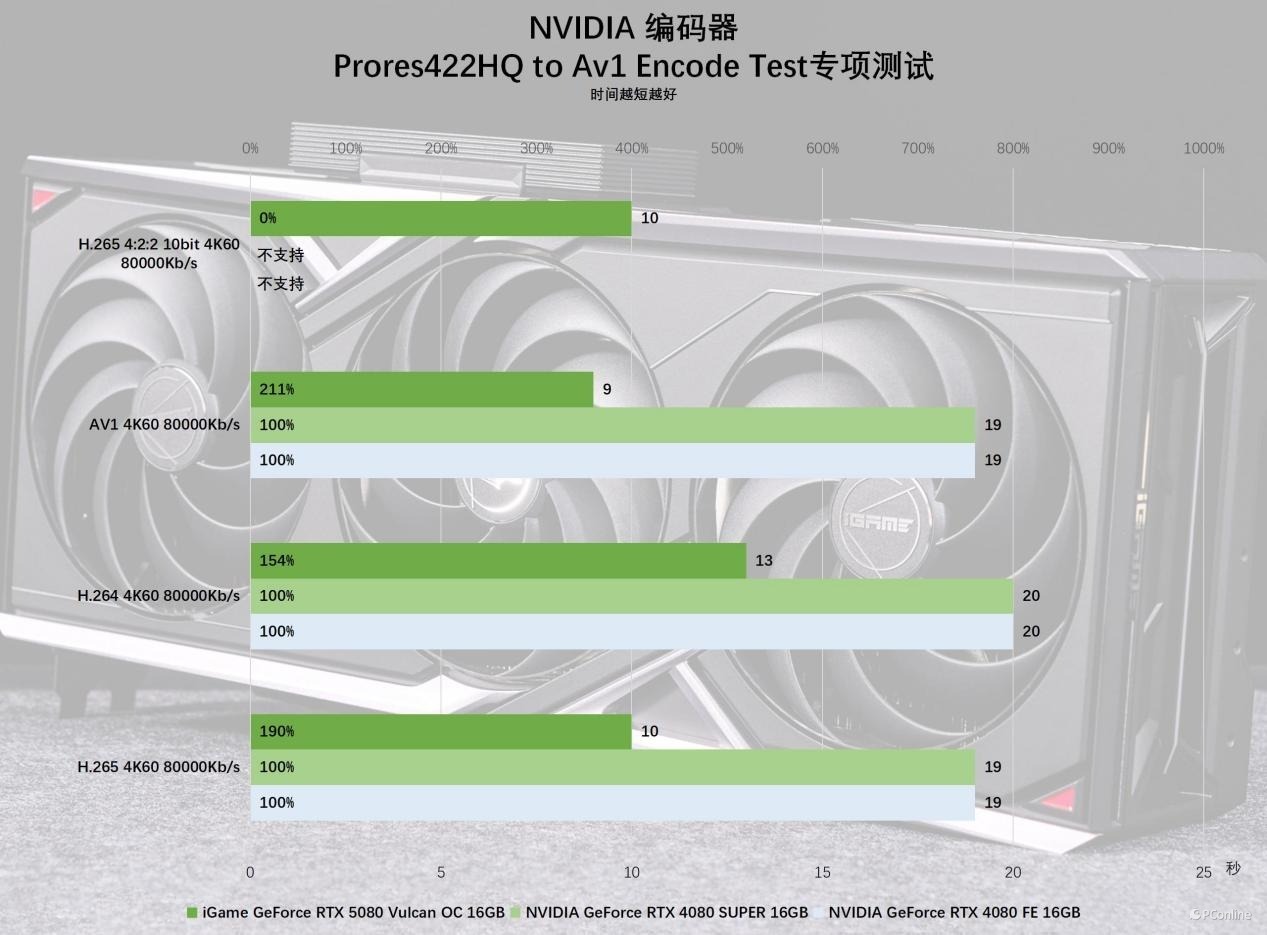 在Adobe以及达芬奇的Benchmark测试里,iGame GeForce RTX 5080 Vulcan OC 16GB火神整体相比RTX 4080或RTX 4080 SUPER也有小幅提升,不过提升比较大的还是视频编辑部分,究其原因还是因为这一代RTX 5080再度对编码器进行了升级,不仅编解码的效率更高,同时支持的格式也更丰富。