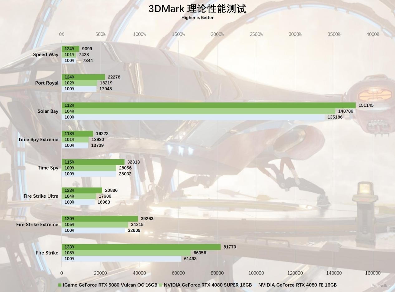 在测试环节,我们首先关注3DMARK的理论性能指标。在FireStrike系列测试中,iGame GeForce RTX 5080 Vulcan OC 16GB火神的表现引人注目,其性能与RTX 4080相比,领先优势更是扩大至33%。在以DX12为基准的Time Spy测试中,iGame GeForce RTX 5080 Vulcan OC 16GB火神显卡的得分为32313,相较于RTX 4080 SUPER或RTX 4080显卡,均能保持约15%的领先优势。
