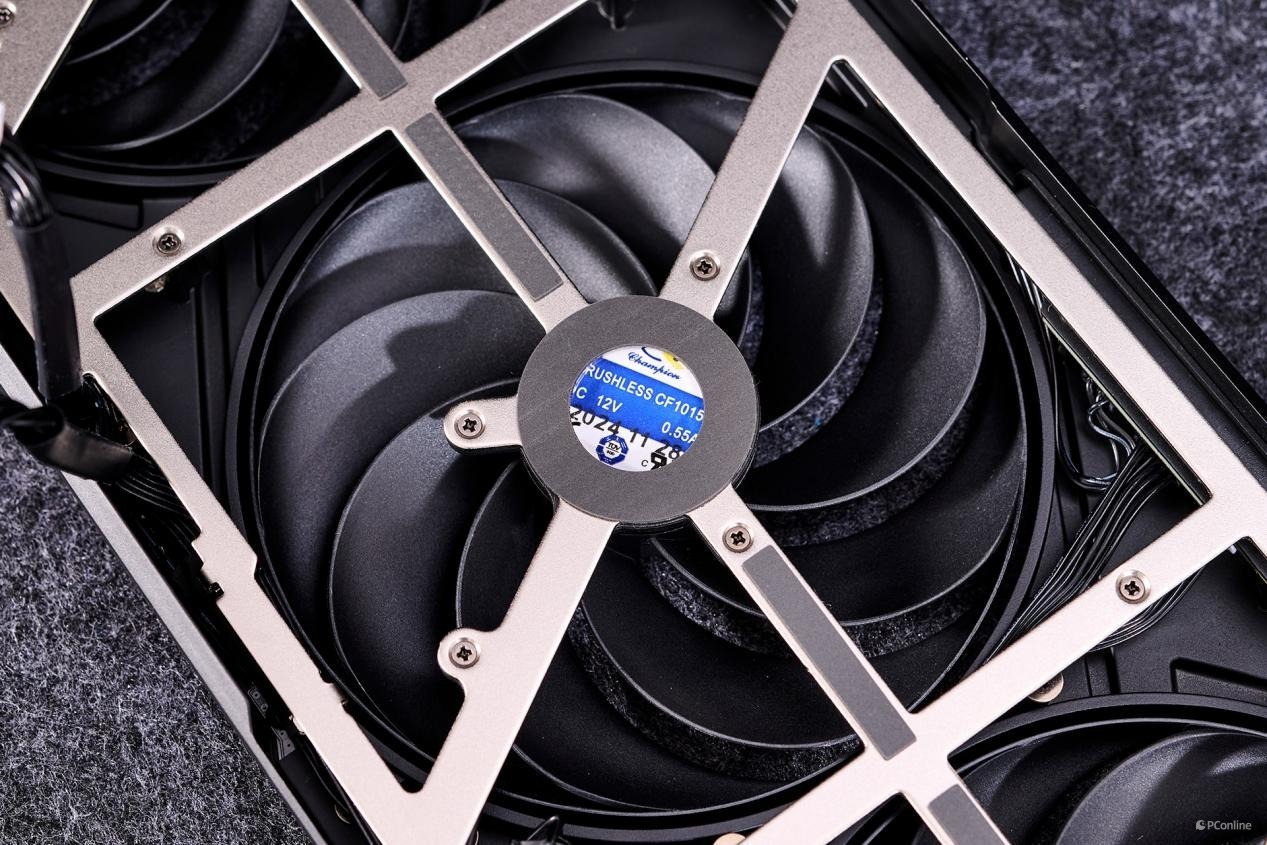 三个直径为 107mm 的大口径 “风镰” 扇叶格外引人注目,这种独特的设计能够使空气形成旋涡聚风吸入,有效提升风压,增加进风量,为显卡的稳定运行提供了充足的散热保障。