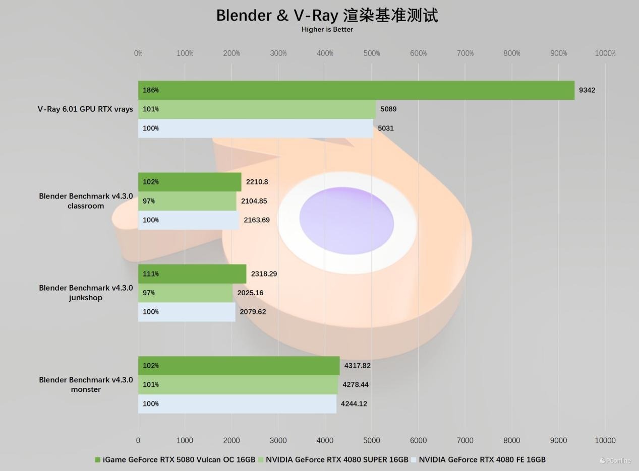 看完了图像视频方面的创作,我们再把目光投向3D渲染以及工业领域的软件中,看看RTX 50系显卡又有怎样的精彩表现。还是熟悉的朋友Blender以及V-Ray,在这两款软件中,iGame GeForce RTX 5080 Vulcan OC 16GB火神的表现也是大杀四方,其中前者基本上能领先RTX 4080 SUPER达2%~11%,而后者就夸张了,对比两张40系卡,甚至可以领先至86%。