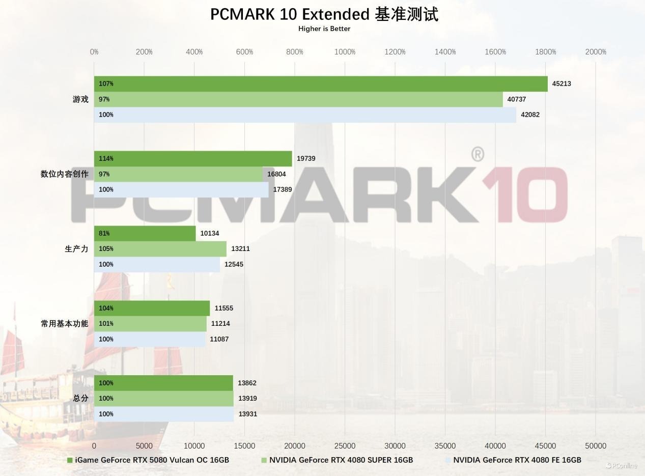 游戏测试完成后,接下来让我们关注创作者们所关心的生产力性能。在PCMark10 Extended测试中,iGame GeForce RTX 5080 Vulcan OC 16GB火神在游戏和数字内容创作方面的表现更为出色,相较于RTX 4080,其性能提升了大约7%和14%。然而,在生产力测试方面,成绩略显逊色,这可能是因为当前驱动程序尚未完全优化。