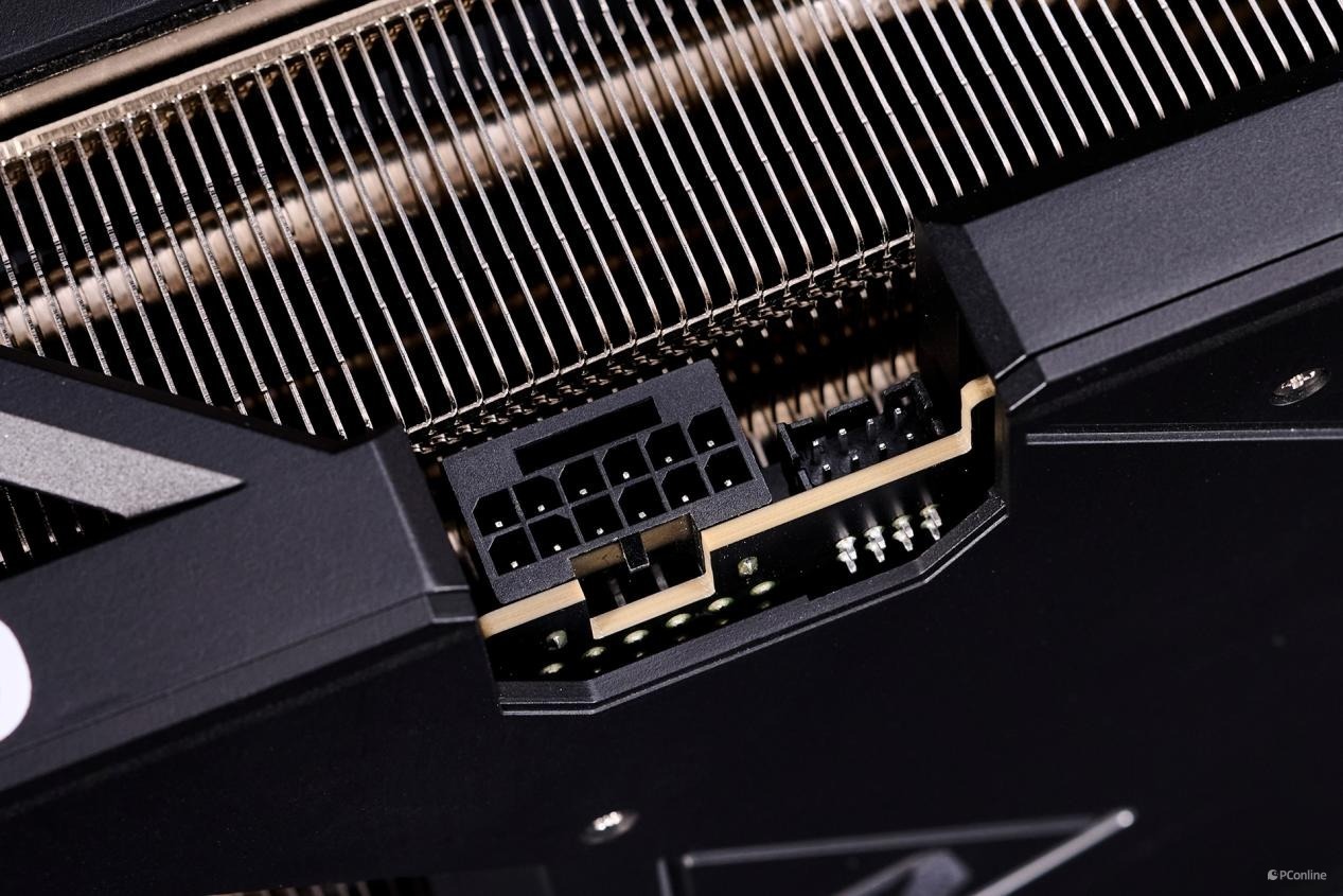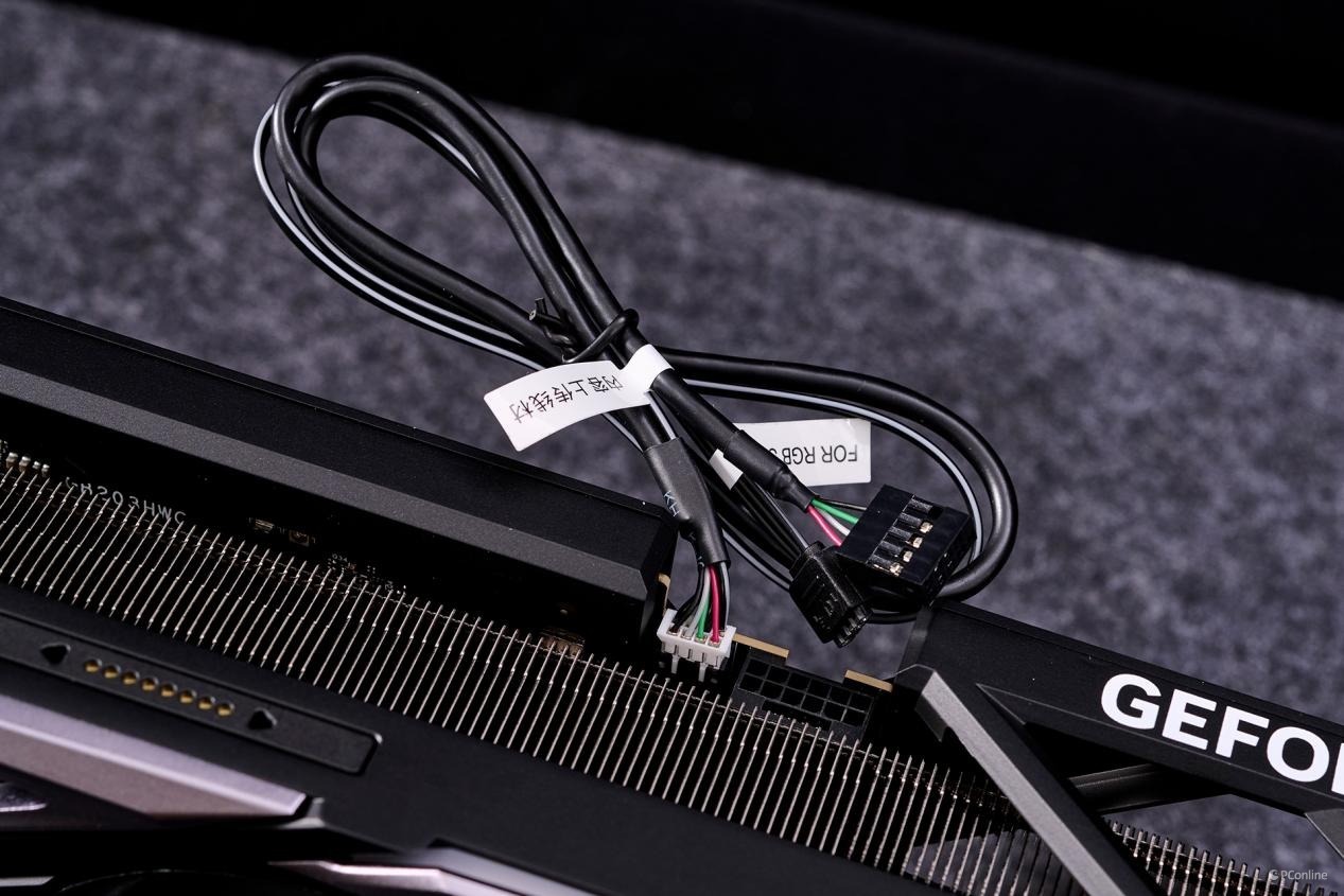 显卡单 16Pin 的外接供电接口,旁边保留的灯光控制线和 USB 数据传输线,用于灯光传输和 LCD 屏幕的画面同步,为用户提供了更多的个性化设置空间。