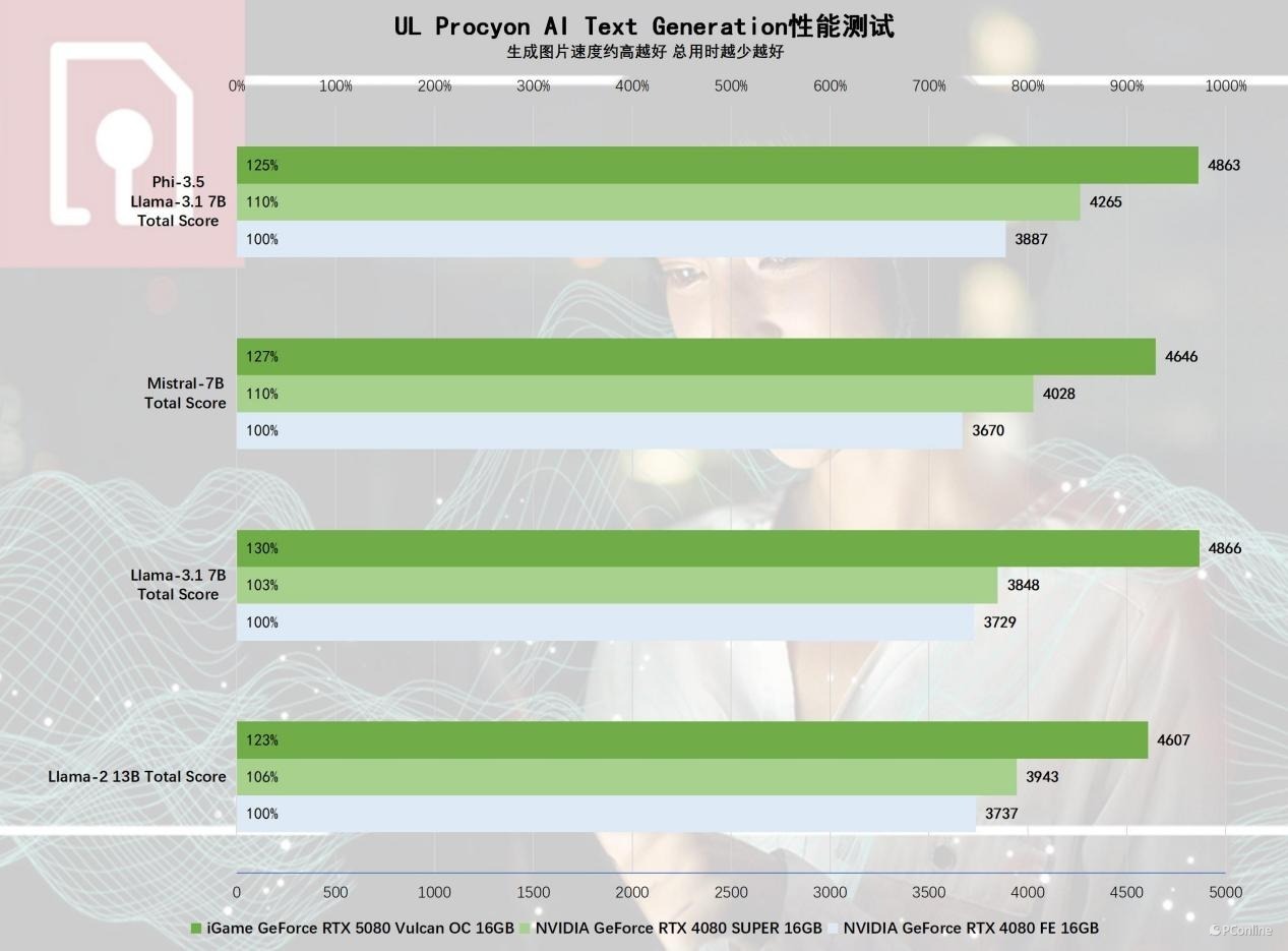 接着我们又用UL Procyon的AI Text Generation测试了更多的大语言模型,iGame GeForce RTX 5080 Vulcan OC 16GB火神的优势依旧十分明显,在以Llama 3.1 7B LLM打造的Phi-3.5测试中,新一代显卡取得4550分的成绩,相比RTX 4080提升了17%,相比RTX 4080 SUPER则提升了7%;将参数扩大至Llama 2 13B的测试中,iGame GeForce RTX 5080 Vulcan OC 16GB火神的表现更加亮眼,4831分的表现已经离RTX 4090不远了,对比性能的话,则可以领先RTX 4080约29%,领先RTX 4080 SUPER 23%以上。