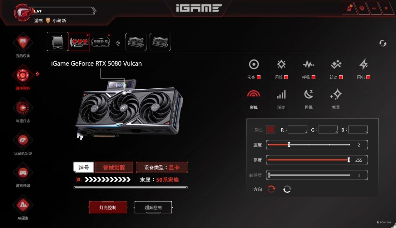 通过iGameCenter 还能控制iGame GeForce RTX 5080 Vulcan OC 16GB火神的ARGB灯效,以及进行显卡的超频控制。