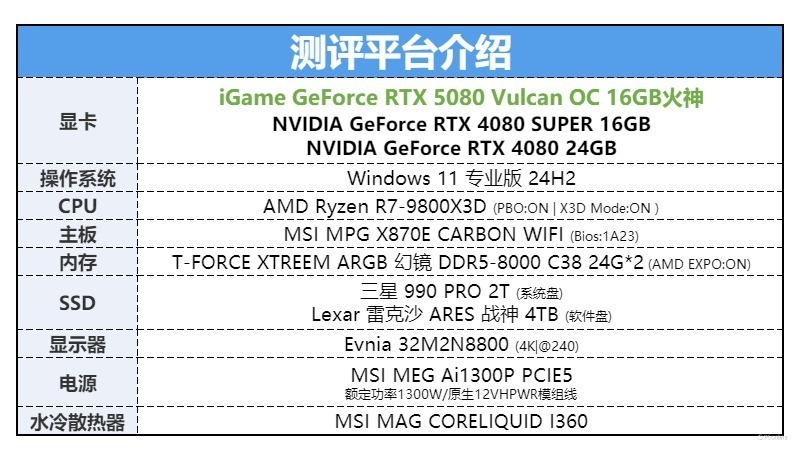 虽然理论性能只是理论上的数据,实际表现还需在游戏世界中亲自体验,才能真正了解iGame GeForce RTX 5080 Vulcan OC 16GB火神的真正实力。为此,我们精心挑选了11款游戏进行测试,覆盖了光追和光栅渲染性能的各个方面。在游戏画质设置上,我们一律选择了最高画质选项,对于光追效果,只要游戏支持,我们便启用最高设置。