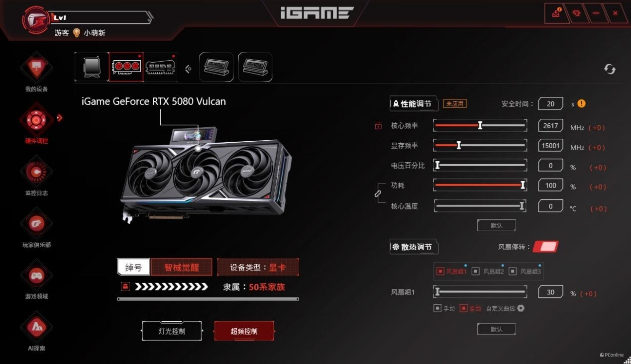 目前最新版本的iGameCenter - 2.0.0.64已经能够支持iGame GeForce RTX 5080 Vulcan OC 16GB火神显卡的正常识别。