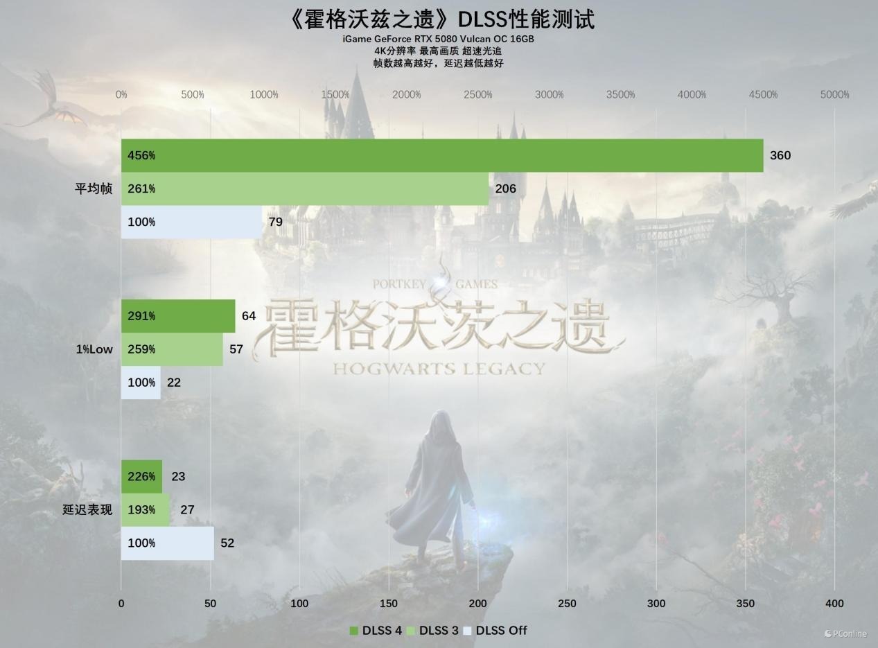 经过体验,《霍格沃兹之遗》这款游戏的优化表现相当出色。在4K分辨率和光线追踪均调至最高设置的情况下,使用iGame GeForce RTX 5080 Vulcan OC 16GB火神,即便不启用任何超采样技术,平均帧率也能达到79 FPS,确保了游戏的流畅运行。当启用DLSS 3性能模式后,帧率进一步提升至206 FPS,游戏体验变得异常流畅。而开启DLSS 4模式时,帧率更是惊人地达到了360 FPS,这已经远远超出了当前大多数显示器的高刷新率范围。与原生4K设置相比,性能提升了超过4.5倍。在实际游戏过程中,无论是1%最低帧率还是延迟表现都相当优秀,特别是延迟,甚至比原生分辨率下还要低,带来了更佳的操控感。