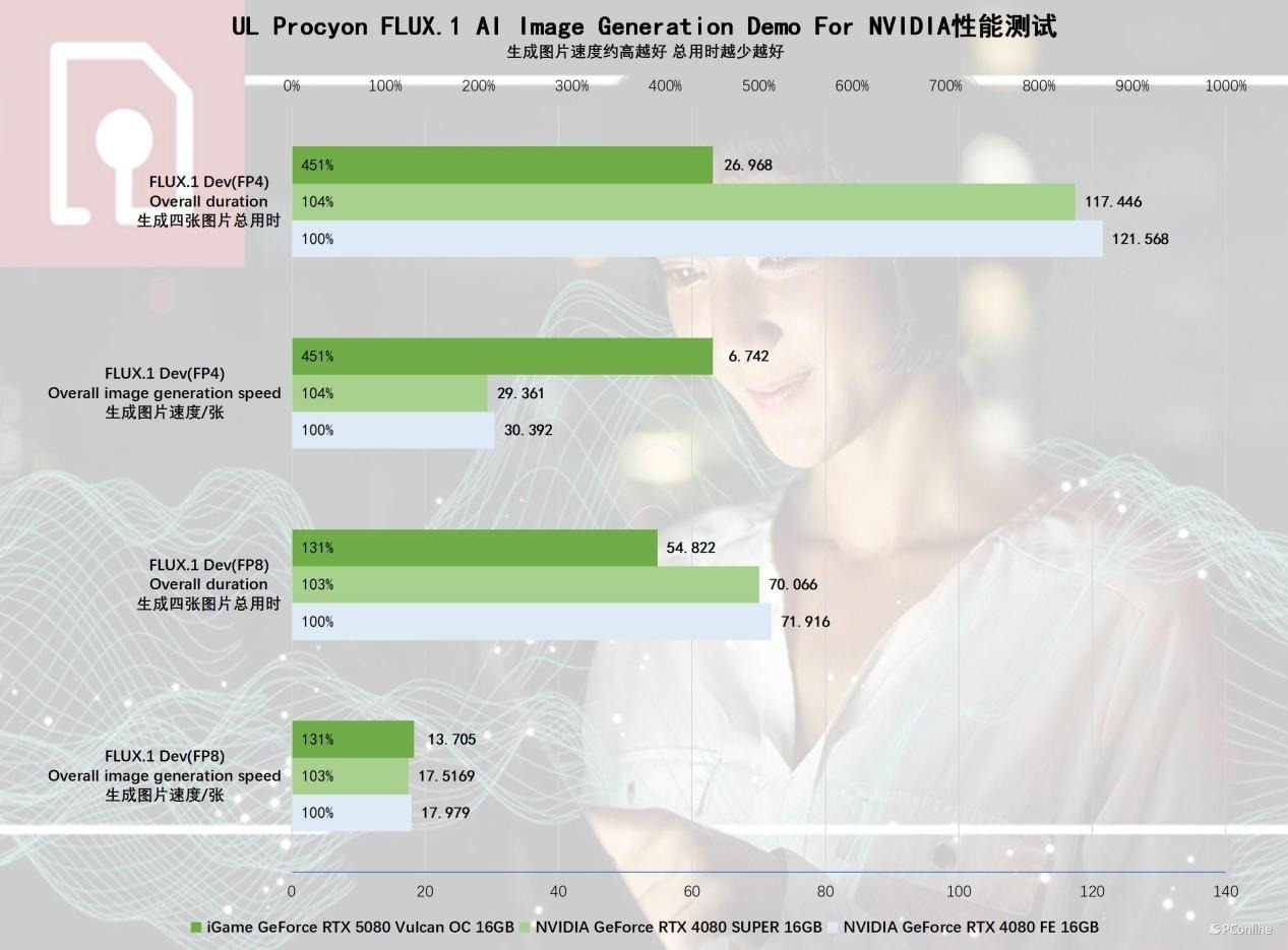 不信你看,我们用UL Procyon的FLUX.1 AI Image Generation Demo For NVIDIA进行测试。在均使用FP8精度模型时,iGame GeForce RTX 5080 Vulcan OC 16GB火神能够做到13.705s生成一张图,而RTX 4080或RTX 4080 SUPER则要17秒以上;而切换到FP4精度模型后,速度才真正拉开了差距,其中iGame GeForce RTX 5080 Vulcan OC 16GB火神生成图片的速度能够提升到6.742秒一张,效率翻了一倍不止。而RTX 4080或RTX 4080 SUPER的生成时间则不降反升,RTX 5080对比它们的性能,拉大到了3.5倍以上。