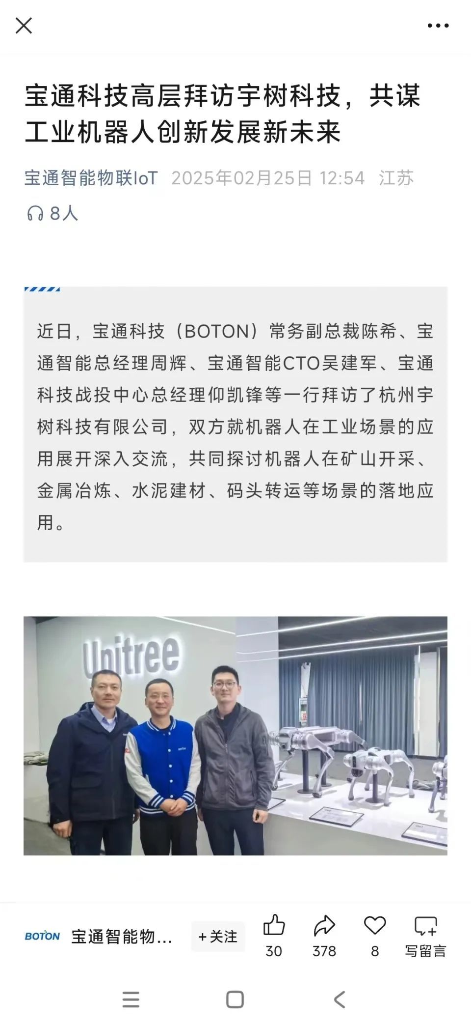 时代财经注意到,早在2月25日午间,宝通科技旗下控股子公司宝通智能物联的微信公众号就发布文章宣称,近日宝通科技常务副总裁陈希等一行人拜访了宇树科技,“双方就进一步推动工业机器人技术的创新与落地、助力工业智能化转型达成共识”。宝通科技股价随即大涨,一度上涨超15%。