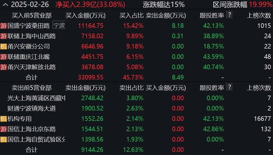 据Wind显示,国盛证券宁波桑田路证券营业部席位为知名游资宁波桑田路的席位。