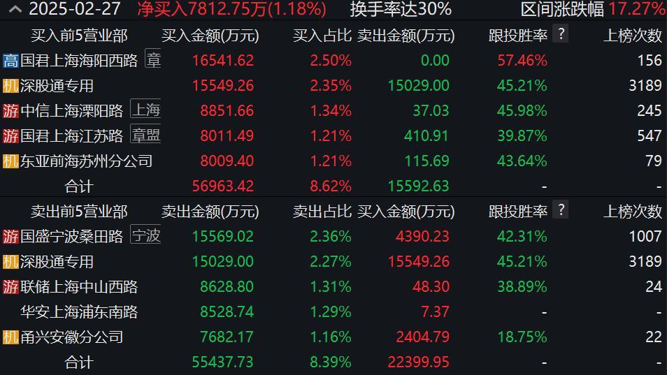 Wind龙虎榜数据显示,上榜营业部席位全天成交11.98亿元,占当日总成交金额比例为18.13%。其中,买入金额为6.38亿元,卖出金额为5.6亿元,合计净买入7812.75万元。具体来看,国泰君安证券上海海阳西路证券营业部、深股通专用分别买入1.65亿元、1.55亿元;国盛证券宁波桑田路证券营业部、深股通专用分别卖出1.56亿元、1.50亿元。