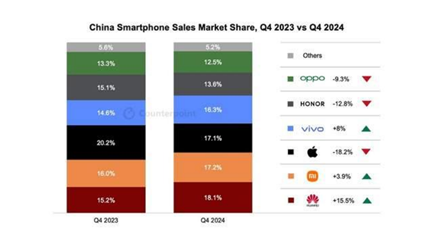 在今天,国产厂商早已成为市场上主要角色,其中华为一马当先:据BCI数据显示,2024年1月-12月,华为以18.3%的销量占比,在国内排名第一;Counterpoint数据显示,2024年Q4,华为市场份额18.1%,排名第一,同比增长15.5%;IDC数据显示,2024年全年,华为市场份额16.6%,位居第二,同比增长50.1%。