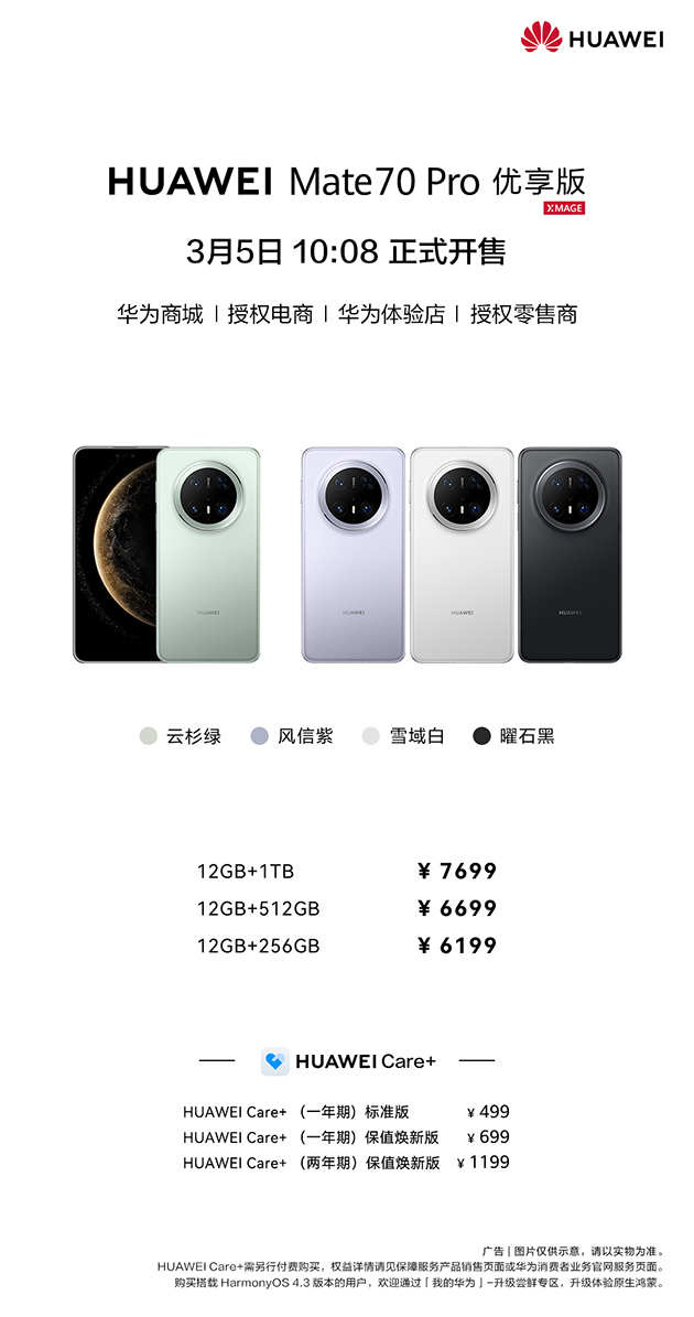 作为华为Mate 70系列新成员,华为Mate 70 Pro 优享版延续了系列超强的AI智能体验、美学设计和移动影像、卫星通信技术和性能体验。这款新机将从 3 月 5 日开始,在各大渠道开始销售,相较于华为Mate 70 Pro直降300元,让更多消费者可以“即刻入手,优先享受”。