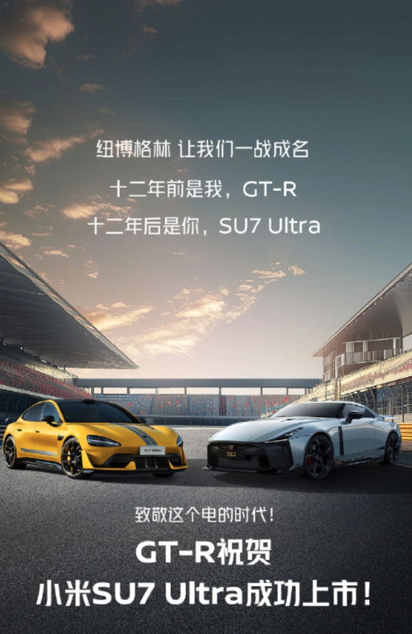 【CNMO科技消息】2月27日晚,小米SU7 Ultra正式上市,售价52.99万元。随后,不少车企纷纷发文祝贺该车的成功上市。2月28日,东风日产GT-R也发布祝贺消息,称:“纽博格林赛道让我们一战成名。十二年前,是GT-R;十二年后,是你,SU7 Ultra。致敬这个电动化的新时代!”