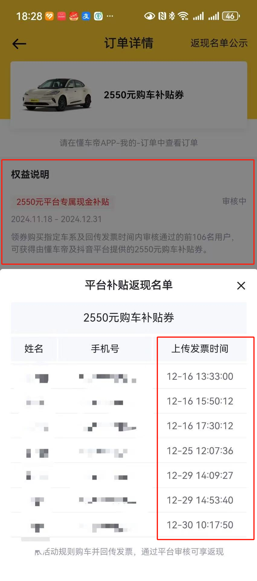 周先生很快在懂车帝APP上相中爱车,并在线下门店完成购买后,问题出现了!“我就特别纳闷,12月17日我在规定的时间内,上传了购车发票和相关材料,但承诺的补贴券一直未到账,我的订单一直状态显示‘审核中’,但比我提交材料晚的人,却已经获得了补贴券。”