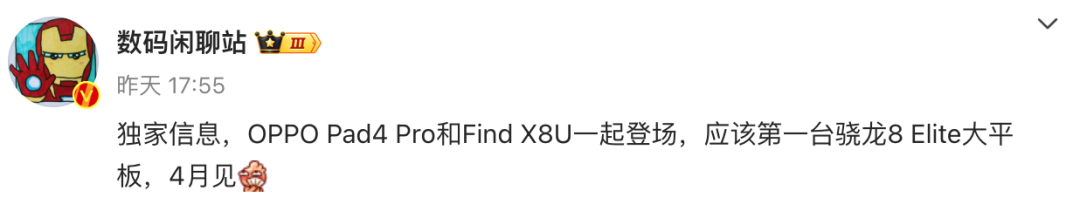 据博主 @数码闲聊站 爆料,OPPO Pad4 Pro 平板将与 OPPO Find X8 Ultra 手机一同在 4 月登场,OPPO Pad4 Pro 有望成为第一台骁龙 8 至尊版大平板。