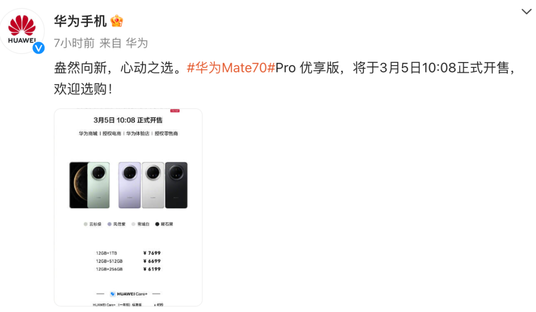 今日,华为Mate 70 Pro 优享版发布,新机将于 3 月 5 日 10:08 开售,售价 6199 元起,相较于 Mate 70 Pro 优惠 300 元。