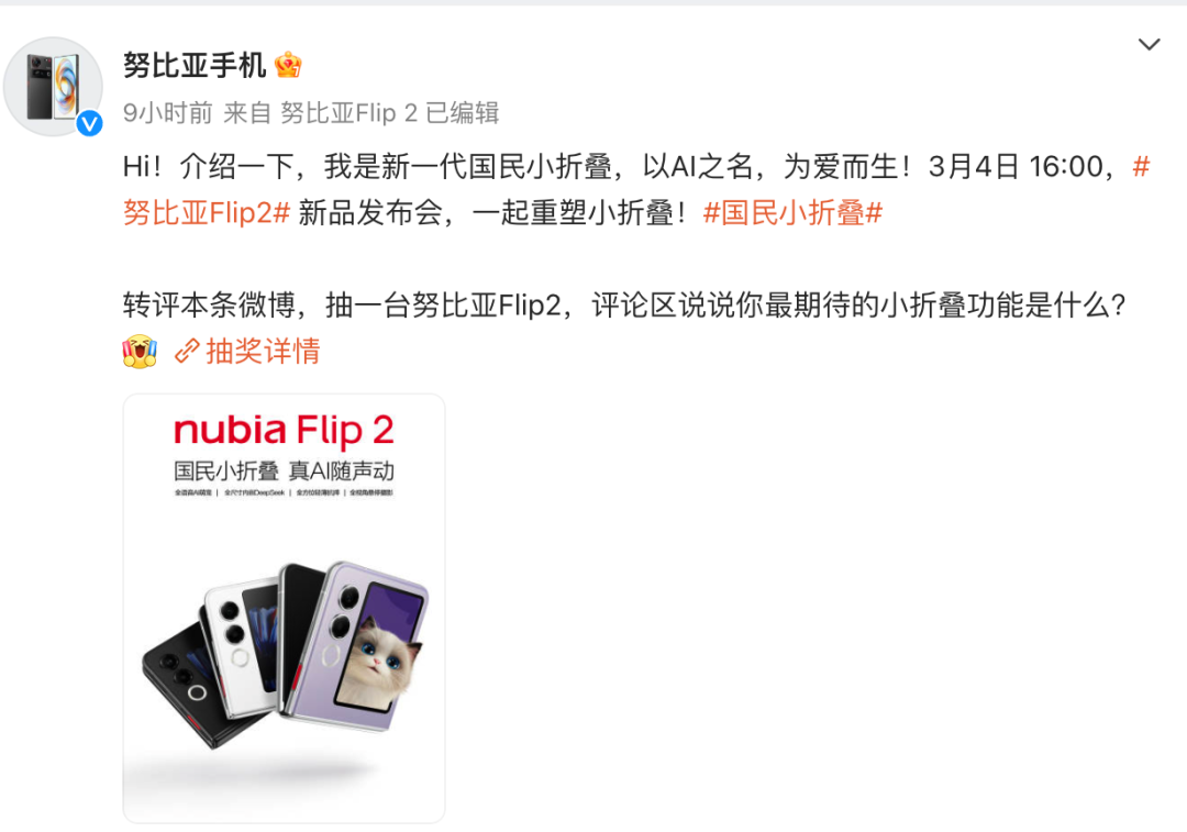 努比亚 Flip 2 小折叠手机今日正式亮相,新机号称“新一代国民小折叠”,将于 3 月 4 日 16:00 发布。