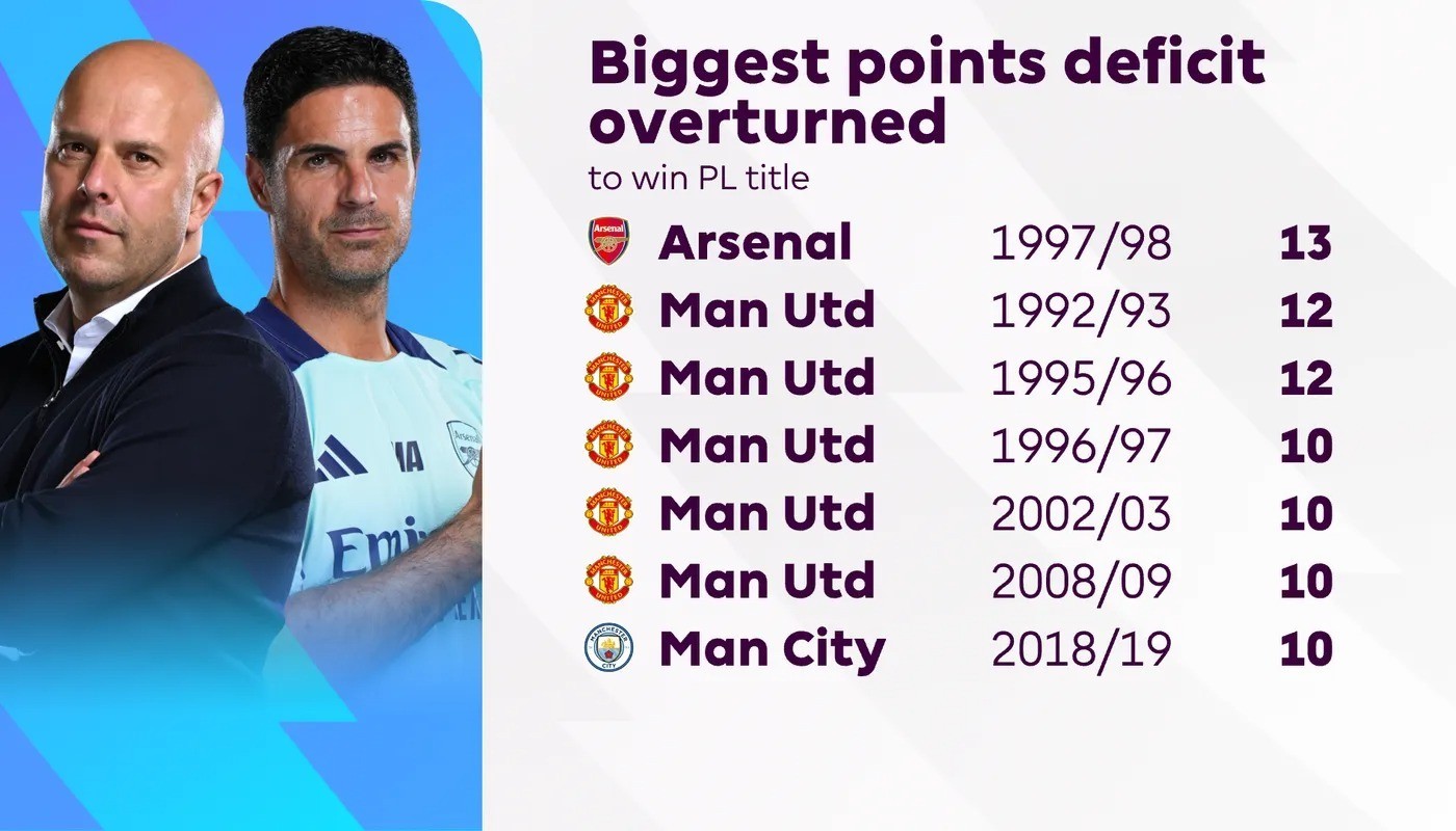 1997-98赛季,曼联在12月底领先阿森纳13分,直到2月份仍领先阿森纳12分,但阿森纳在赛季尾声阶段完成了10连胜,其中包括一场与曼联的正面对决,最终提前两场夺冠。