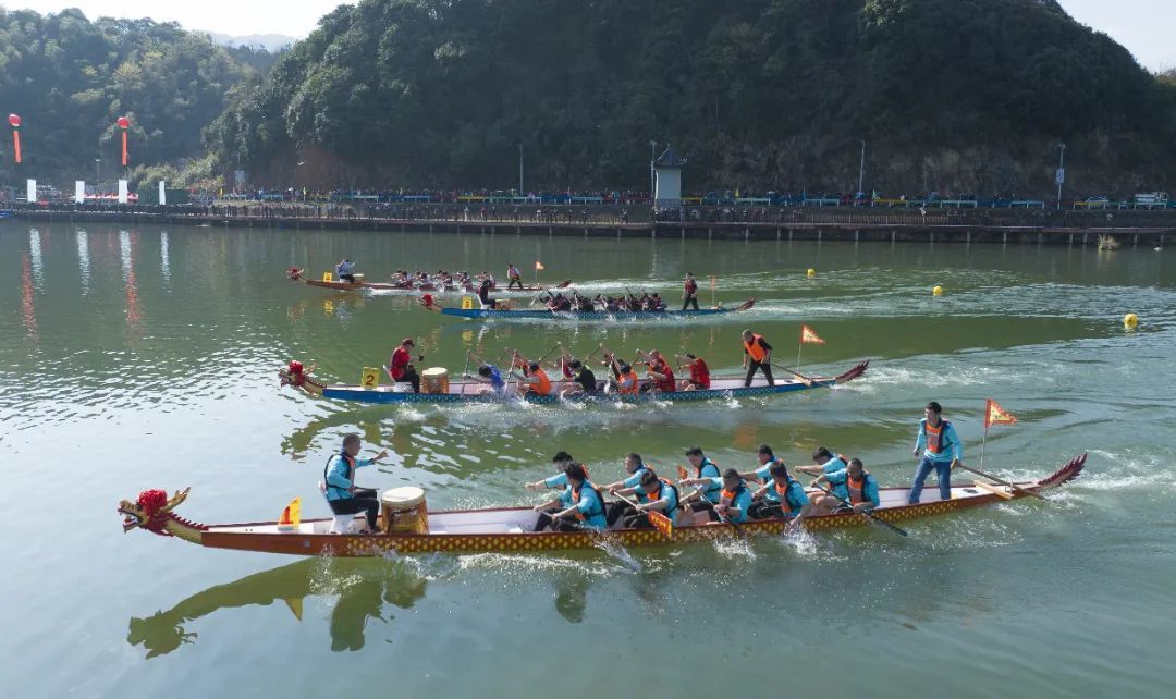 “一点眼睛,祈求风调雨顺,国泰民安;二点天庭,祈求吉星高照,鸿运当头;三点鼻子,祈求和谐幸福,万家平安……”“点睛仪式”后,一支支身着“劲装”的参赛队蓄势待发。号令一响,霎时锣鼓震天,桡手们挥桨击水,逐浪争流,4条“猛龙”乘风破浪、奋楫击水,每一次划桨都凝聚着力量与汗水,彰显着团队协作与竞技精神,一幅奋勇争先的精神画卷展现在眼前。溪上,浪花飞溅,龙舟飞驰。岸上,游人如织,竞相呐喊。龙舟的“切磋”,为现场观众带来了一场震撼人心、酣畅淋漓的视觉和听觉的综合享受。