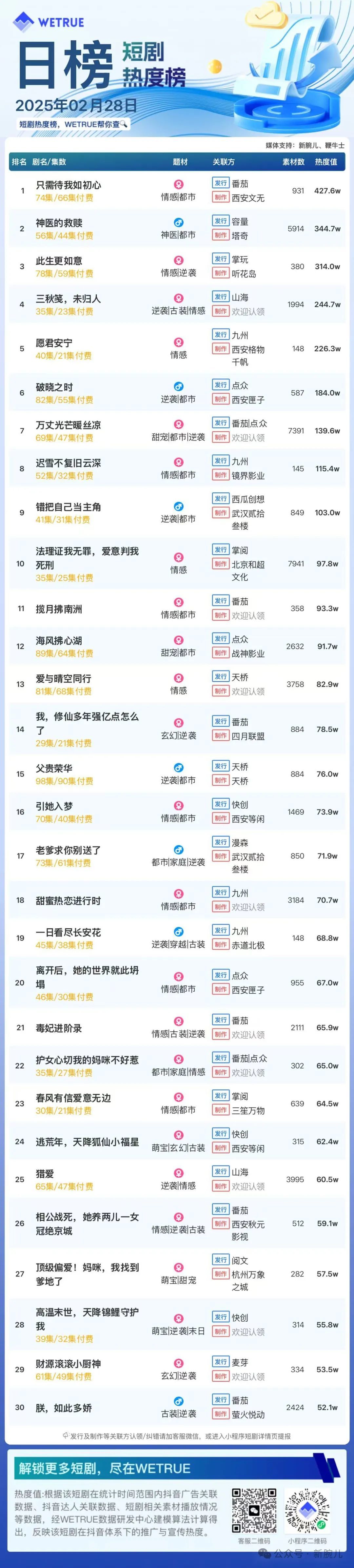 新腕儿公众号将每天发布竖屏短剧热度榜,建议关注,随时查看。