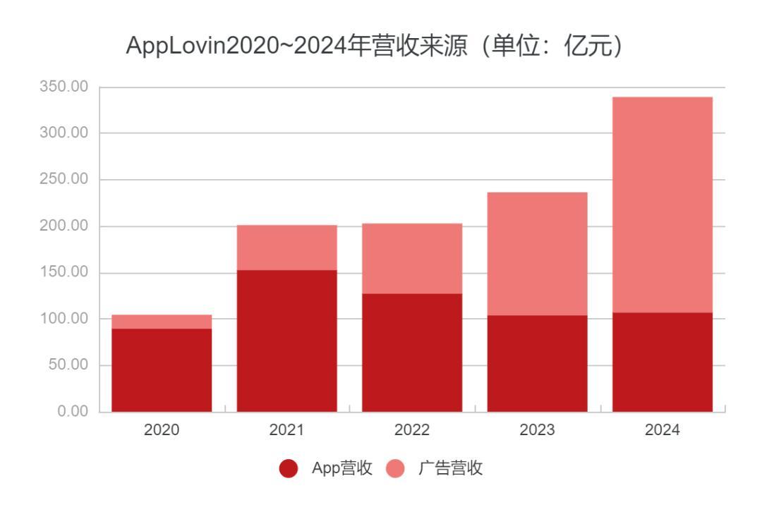 自此开始,靠着AXON的加持,公司的广告业务开始迅速增长,仅用两年时间就赶超了游戏业务的盈利能力。2023年时AXON升级到了2.0版本,让广告业务收入在接下来的一年里实现了近乎翻倍的增长,一跃成为公司的顶梁柱。就算不靠游戏业务,AppLovin也已经能够单纯以广告公司的身份过得相当滋润了。